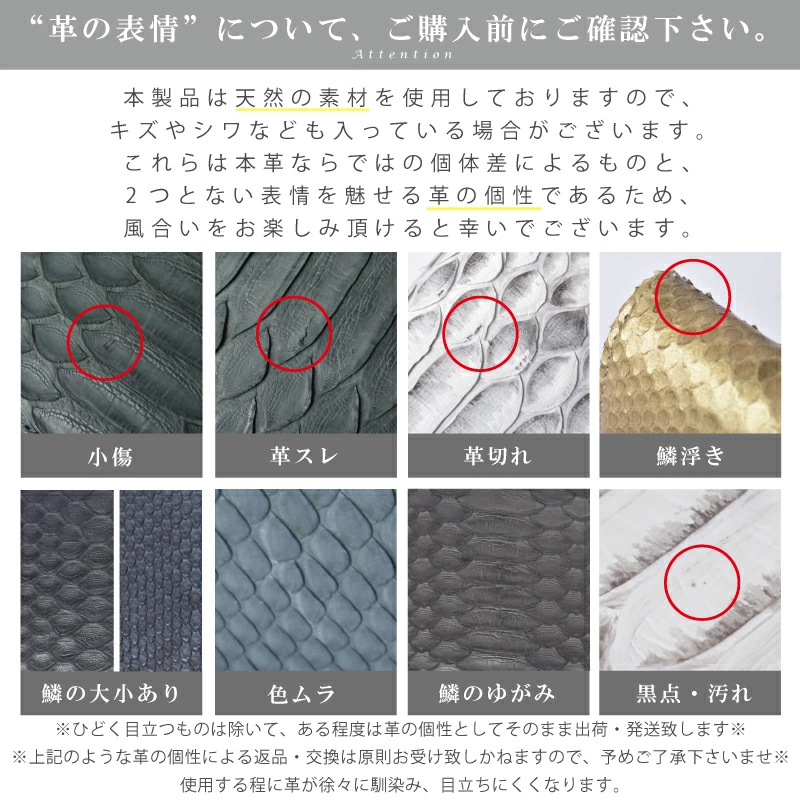 | その他詳細 | ※当店で使用している本革は全て本物の革を使用しています。 その為、皮革の模様など掲載画面と異なる場合がございます。 また天然皮革に関してはワシントン条約を元に適正に輸入された商品を販売しています。 ※撮影に使用された商品が届く場合がございますが、当店の運営に基づき、出荷時に問題の無いと判断し販売しております。 |