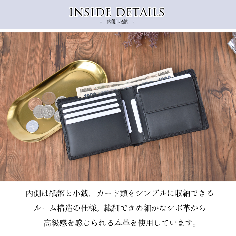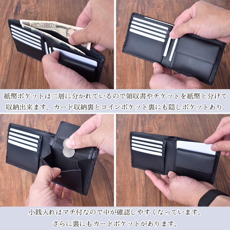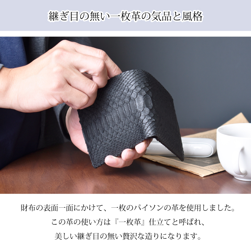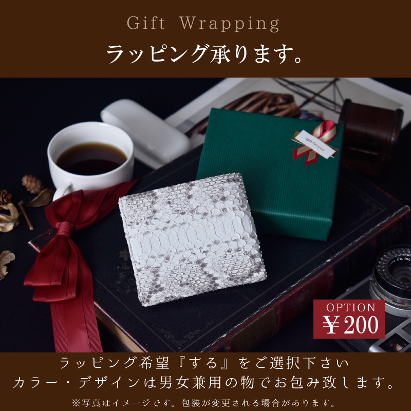 | 特徴 | -パイソンマテリアル- パイソンの特徴はこの個性的で美しいウロコ模様にあります。 ラグジュアリーな雰囲気があり、エキゾチックレザーならではの 表情をお楽しみ頂けます。 繊細な見た目ではありますが、鱗が剥がれたりする事はありません。 使うほどに何とも言えない色味に深みが生まれ、艶が増していきます。 -継ぎ目の無い一枚革の気品と風格- 財布の表面一面にかけて、一枚のパイソンの革を使用しました。 この革の使い方は『一枚革』仕立てと呼ばれ、 美しい継ぎ目の無い贅沢な造りになります。 -内側素材と収納- 内側は紙幣と小銭、カード類をシンプルに収納できる ルーム構造の仕様。繊細できめ細かなシボ革から 高級感を感じられる本革を使用しています。 紙幣ポケットは二層に分かれているので領収書やチケットを紙幣と分けて 収納出来ます。カード収納裏とコインポケット裏にも隠しポケットあり。 小銭入れはマチ付なので中が確認しやすくなっています。 さらに裏にもカードポケットがあります。 -鱗模様について- ・ナチュラル・パールゴールド・ネイビー ひとつとして同じ模様のない個性あふれる柄ありカラー ・グリーン・ブラック 繊細な鱗の立体感を活かした模様なしカラー -証明試験を行ったヘビ革を使用しています- お客様に安心してご購入いただけるよう、MGSABLEでは本革の証明試験を行っております。 -“革の表情”について、ご購入前にご確認下さい。- 本製品は天然の素材を使用しておりますので、キズやシワなども入っている場合がございます。 これらは本革ならではの個体差によるものと、2つとない表情を魅せる革の個性であるため、 風合いをお楽しみ頂けると幸いでございます。 ※ひどく目立つものは除いて、ある程度は革の個性としてそのまま出荷・発送致します※ ※上記のような革の個性による返品・交換は原則お受け致しかねますので、予めご了承下さいませ※ 【上記のような症状は使用する程に、徐々に革が馴染み目立ちにくくなるものもあります】 -ラッピング承ります。- ラッピング希望『する』をご選択下さい カラー・デザインは男女兼用の物でお包み致します。 ※写真はイメージです。包装が変更される場合があります。 |