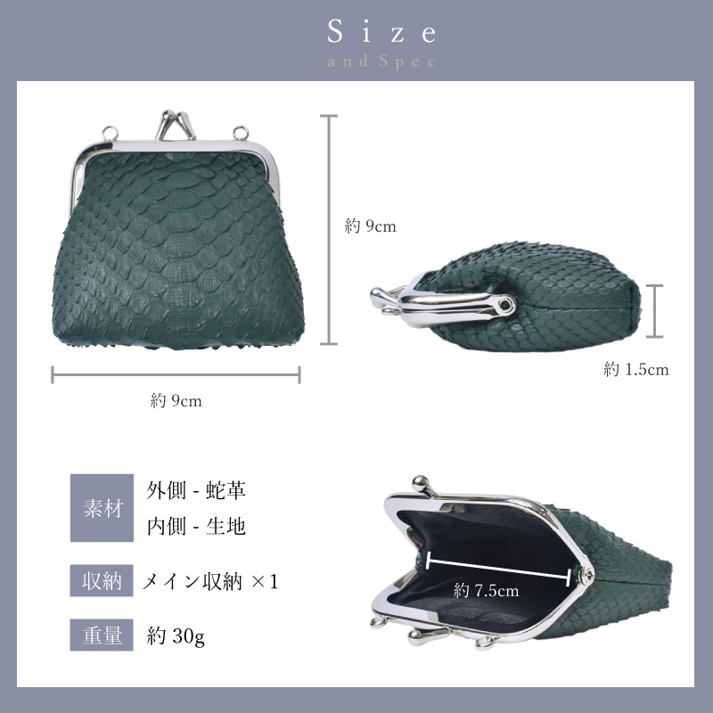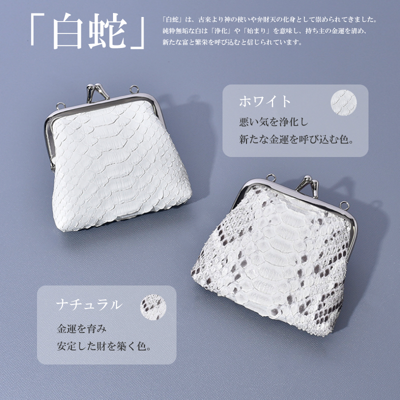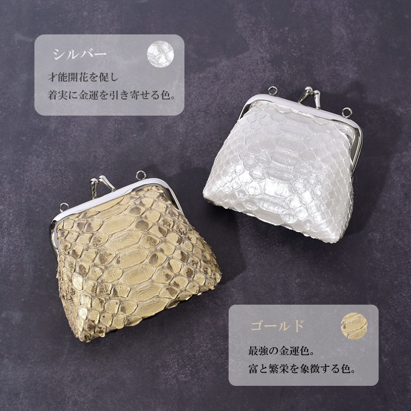 | 特徴 | 幸運を呼び込む!蛇革がま口コインケース♪ ・「金運」を呼び込む蛇革 蛇革の天然素材ならではの唯一無二の表情が、持つ人の個性を引き立てます。 使い込むほどに手に馴染み、艶が増していく経年変化も楽しみの一つです。 古くからヘビは脱皮を繰り返すことから「再生」や「無限」の象徴とされ、特にヘビ革は「金運アップ」の縁起物として珍重されてきました。 ・「開運」の縁起物がま口 がま口は大きく開く口が「財運を招き入れる」として非常に縁起が良いとされています。 この幸運モチーフが、あなたの金運と良縁を力強くサポートしてくれるでしょう。 ・男女兼用デザイン コンパクトで洗練されたデザインは、性別を問わずどなたでもお使いいただけます。 ・「白蛇」 白蛇は、古来より神の使いや弁財天の化身として崇められてきました。 純粋無垢な白は「浄化」や「始まり」を意味し、持ち主の金運を清め、新たな富と繁栄を呼び込むと信じられています。 ・10色のバリエーション 「ホワイト」 悪い気を浄化し、新たな金運を呼び込む色。 「ナチュラル」 金運を育み、安定した財を築く色。 「シルバー」 才能開花を促し、着実に金運を引き寄せる色。 「ゴールド」 最強の金運色。富と繁栄を象徴する色。 「グリーン」 成長と再生を意味し、着実に金運を増やしていく色。 「ブラック」 今ある財産を守り、新たな金運を呼び込む色。 「ネイビー」 信頼と落ち着きを与え、仕事運から金運を上げる色。 「ダークブラウン」 安定した金運をもたらし、貯蓄運を高める色。 「ベージュ」 堅実にお金を貯め、安心できる金運をもたらす色。 「グレージュ」 不要な出費を抑え、冷静な判断力で金運を守る色。 ・手のひらサイズ キャッシュレス時代に最小限の現金を持ち歩きたい方にもおすすめです。 ・丸穴つき 金具の両サイドには丸穴があり、チャームやキーホルダーを取り付けてアレンジをお楽しみいただけます。 ・大きく開口 見やすく取り出しやすい設計。 内側は手触りの良い生地張りで、小銭を優しく守ります。 ※内側の生地の色は、商品の色や入荷時期によって異なります。 お選びいただくことはできませんので、あらかじめご了承ください。 ・6色の柄無しカラー 上品さを求める方や、さりげなく蛇革を取り入れたい方におすすめです。 ・4色の柄有りカラー パイソン本来の美しさや天然素材の迫力や個性を楽しみたい方におすすめです。 【認証試験】 お客様に安心してご購入頂けるように、MGSABLEでは本革の認証試験を行っております。 【“革の表情”について、ご購入前にご確認下さい。】 本製品は蛇本革を使用しておりますので、キズやシワなども入っている場合がございます。 これらは本革ならではの個体差によるものと、2つとない表情を魅せる革の個性であるため、風合いをお楽しみ頂けると幸いでございます。 ※ひどく目立つものは除いて、ある程度は革の個性としてそのまま出荷・発送致します※ ※上記のような革の個性による返品・交換は原則お受け致しかねますので、予めご了承下さいませ※ 【上記のような症状は使用する程に、徐々に革が馴染み目立ちにくくなっていきます。】 【エイジングについて】 パイソンの鱗の先端は反り返っているものがございます。これは、湿度などの変化によって起こる自然の状態です。 また、財布やバッグのカーブする部分は特に鱗が立ち上があります。これは「本物の証」であり、型押しレザーでは表現できない表情です。 また日常生活の中で、強い力で引っ張らないかぎり、鱗がめくれる事はありませんのでご安心下さい。 使用する程に革が馴染み、反り返りが少しづつ目立ちにくくなります。 経年変化で表情を徐々に変える。“革を育てる”そんな楽しみ方ができるレザーです。 【ラッピングサービス】 別途プラス200円でラッピングサービスを承ります。 ラピング【希望する】をご選択ください。 【保証】 万が一商品に不良があった場合の安心保証 10日間の商品保証 当社では全てのお客様に安心、ご満足してお買い物を楽しんで頂けるよう『全額返金保証』『新品交換』を行っております。 万が一不具合があった場合でも、誠意を持ってご対応致します。 ●万が一商品に不具合がある場合、商品到着から10日以内であれば、送料を含め返金または交換をさせて頂きます。 ●お客様都合のご返品、交換希望の場合、送料をお客様ご負担とさせていただいております。 ※上記の場合、事前にお問合せフォーム、電話でご連絡をお願い致します。 |