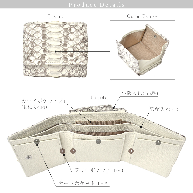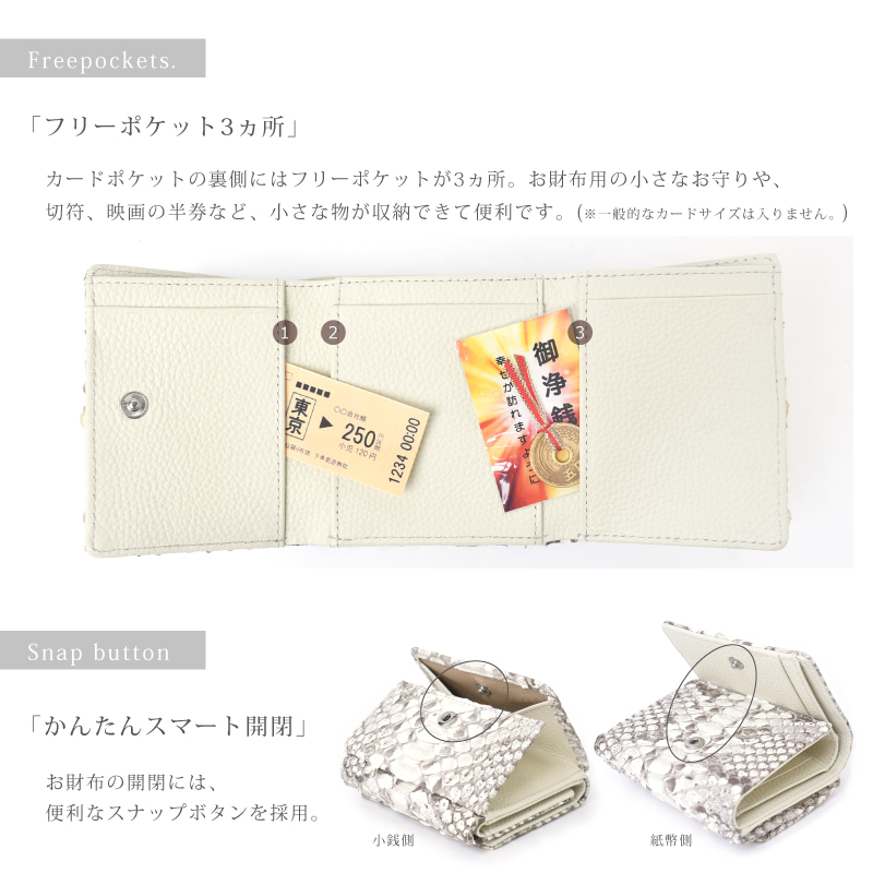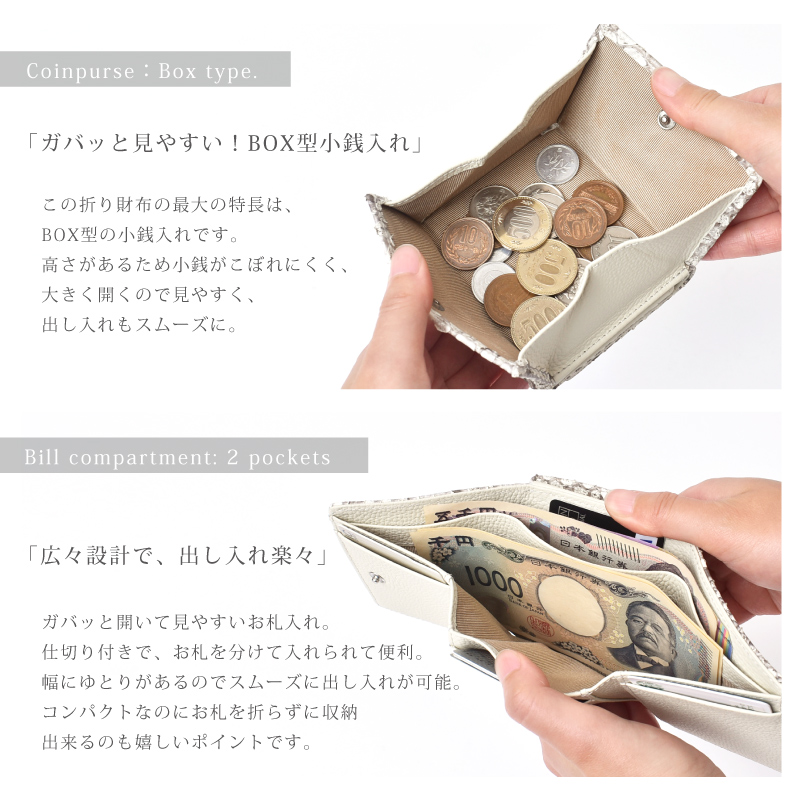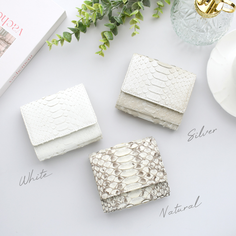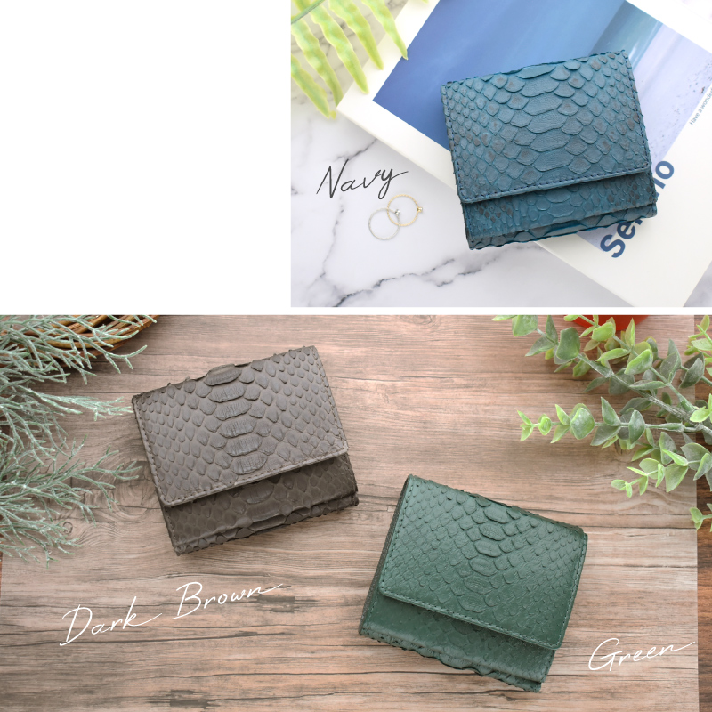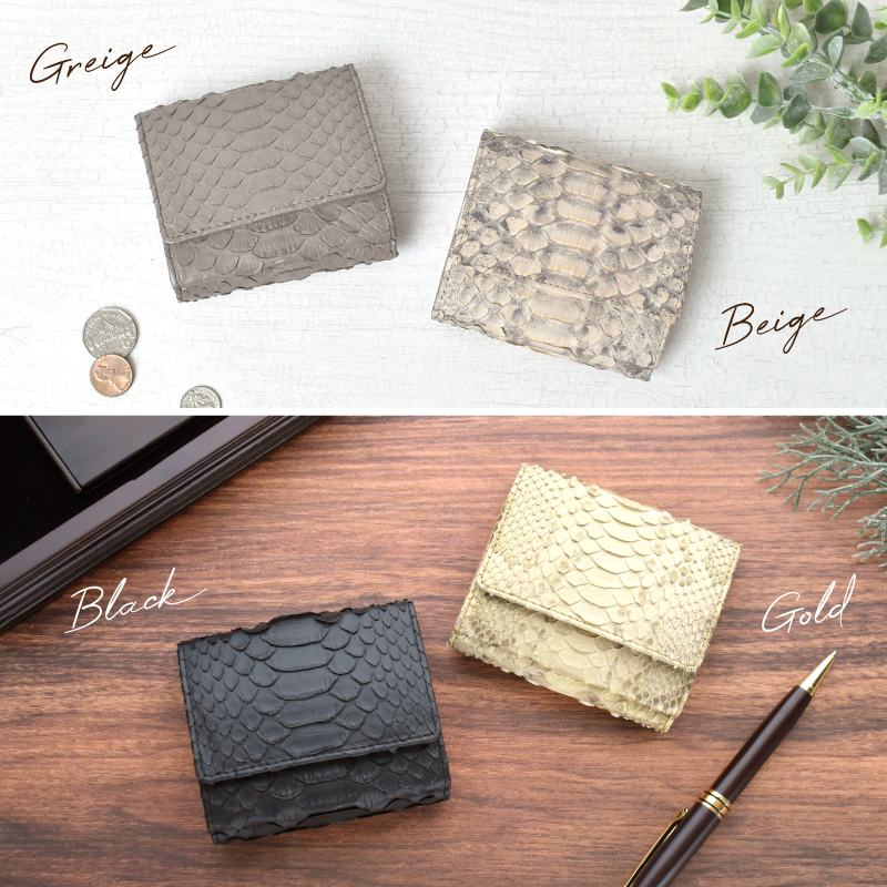 | 特徴 | 天然の優しい手触りと美しさ 使うほどに美しい艶、色味に深みが生まれます。 パイソンの特徴はこの個性的で美しいウロコ模様にあります。 ラグジュアリーな雰囲気があり、エキゾチックレザーならではの表情をお楽しみ頂けます。 繊細な見た目ではありますが、鱗が剥がれたりする事はありません。 使うほどに何とも言えない色味に深みが生まれ、艶が増していきます。 ●ガバッと見やすい!BOX型小銭入れ この折り財布の最大の特長は、BOX型の小銭入れです。 高さがあるため小銭がこぼれにくく、大きく開くので見やすく、出し入れもスムーズに。 ●広々設計で、出し入れ楽々 ガバッと開いて見やすいお札入れ。仕切り付きで、お札を分けて入れられて便利。 幅にゆとりがあるのでスムーズに出し入れが可能。 コンパクトなのにお札を折らずに収納出来るのも嬉しいポイントです。 ●4つのポケットですっきり収納 カードポケットは内側に3ヵ所、紙幣入れに1ヵ所あり、最大6〜7枚のカードが収納可能。 外側と同系色の牛革を使用し統一感のある仕上がりに。 ※真ん中のポケットのみ最大3枚のカードが収納可能 ●フリーポケット3ヵ所 カードポケットの裏側にはフリーポケットが3ヵ所。 お財布用の小さなお守りや、切符、映画の半券など、小さな物が収納できて便利です。 (※一般的なカードサイズは入りません。) ●ワンタッチで、スマート開閉 カード収納や小銭入れ部分の開閉には、便利なスナップボタンを採用。 ●シンプルなデザインなので男女問わずお使いいただけます。 ●証明試験を行ったヘビ革を使用しています お客様に安心してご購入いただけるよう、MGSABLEでは本革の証明試験を行っております。 ●“革の表情”について、ご購入前にご確認ください 本製品はヘビ本革を使用しておりますので、キズやシワなども入っている場合がございます。 これらは本革ならではの個体差によるものと、2つとない表情を魅せる革の個性である為、 風合いをお楽しみ頂けると幸いでございます。 ●ラッピング承ります ご注文の際にラッピング希望『する』をご選択ください。 ※写真はラッピングイメージです。カラー・デザインは男女兼用の物でお包み致します。 【保証】 万が一商品に不良があった場合の安心保証10日間の商品保証 当社では全てのお客様に安心、ご満足してお買い物を楽しんで頂けるよう 『全額返金保証』『新品交換』を行っております。 万が一不具合があった場合でも、誠意を持ってご対応致します。 ●万が一商品に不具合がある場合、商品到着から10日以内であれば、送料を含め返金または交換をさせて頂きます。 ●お客様都合のご返品、交換希望の場合、送料をお客様ご負担とさせていただいております。 ※上記の場合、事前にお問合せフォーム、電話でご連絡をお願い致します。 【エイジングについて】 パイソンの鱗の先端は反り返っているものがございます。これは、湿度などの変化によって起こる自然の状態です。 また、財布やバッグのカーブする部分は特に鱗が立ち上があります。これは「本物の証」であり、型押しレザーでは表現できない表情です。 また日常生活の中で、強い力で引っ張らないかぎり、鱗がめくれる事はありませんのでご安心下さい。 使用する程に革が馴染み、反り返りが少しづつ目立ちにくくなります。 経年変化で表情を徐々に変える。“革を育てる”そんな楽しみ方ができるレザーです。 【幸運を呼び込む蛇革】 『蛇の財布が金運をアップする』と言われるのは、蛇が古来から富や繁栄の象徴とされており、その皮が滑らかで 美しいため風水的にも金運を引き寄せると信じられているからです。 また、魔術的な信念やシンボリズムによって、蛇の皮で作られた財布が金運を増幅させると考えられています。 これらの理由から、蛇の財布が金運に良い影響を与えると信じられています。 【カラーが持つ意味】 ■ブラック 風水的意味:安定・守り・蓄財 効果:お金を「守る」力が強い色。無駄遣いを防ぎ、着実に貯金したい人におすすめ。ビジネス運にも◎。 ■グリーン 風水的意味:成長・癒し・人間関係 効果:コツコツとお金を増やしていきたい人向け。仕事の成果や収入が着実に伸びる色。健康運や人間関係運もサポート。 ■ネイビー 風水的意味:信頼・知性・冷静 効果:仕事運・キャリアアップに効果的。計画的にお金を増やしたい人、堅実な財運を求める人に◎。 ■Dブラウン 風水的意味:安定・堅実・土の気 効果:堅実にお金を増やすパワーがあり、「土」の気は金運を育てる土台。経済的な基盤を築きたい人に最適。 ■シルバー 風水的意味:浄化・変化・才能開花 効果:新しい運気を呼び込む色。停滞していた金運をリセットし、流れを変えたいときにおすすめ。副業やチャレンジにも◎。 ■ホワイト 風水的意味:浄化・リセット・スタート 効果:運気をリセットし、新しい金運を招く色。転職や新生活など、人生の切り替え時に良い選択。清