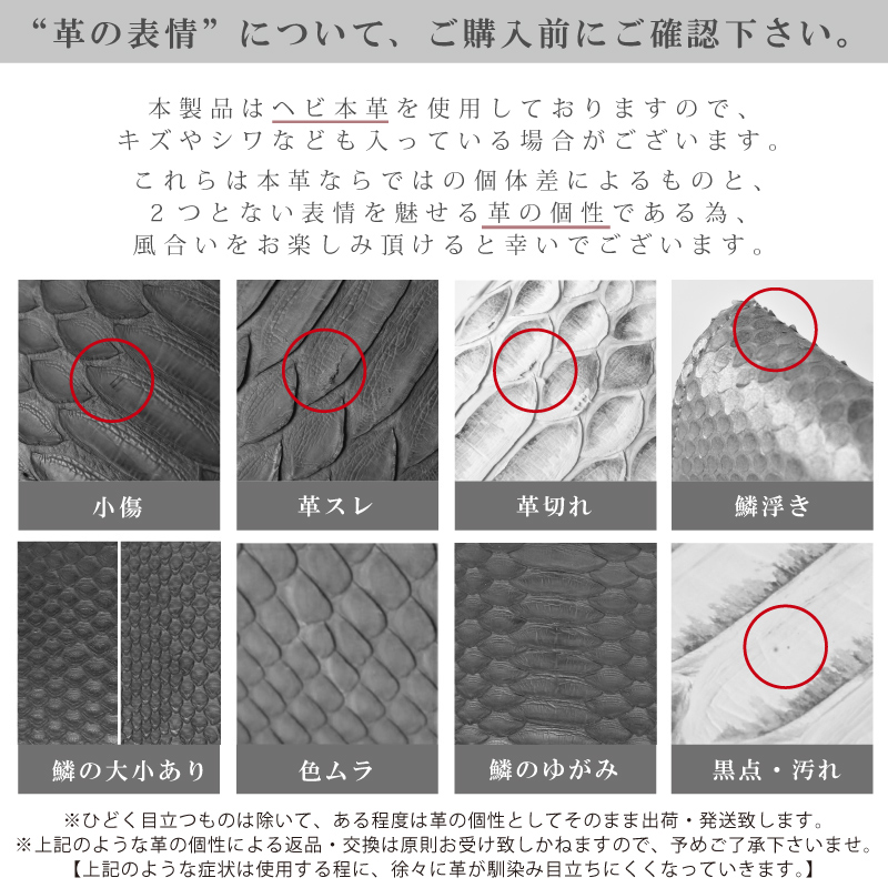 | その他詳細 | 天然皮革に関してはワシントン条約を元に適正に輸入された商品を販売しています。 撮影に使用された商品が届く場合がございますが、当店の運営に基づき、出荷時に問題の無いと判断し販売しております。 |