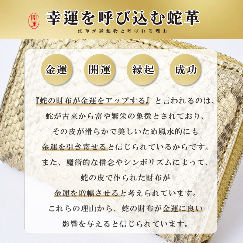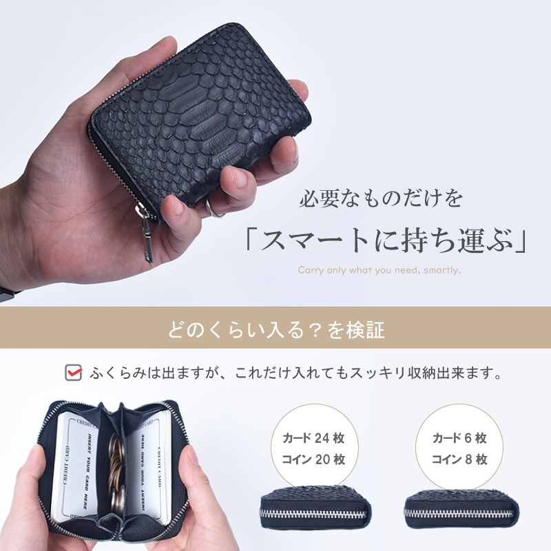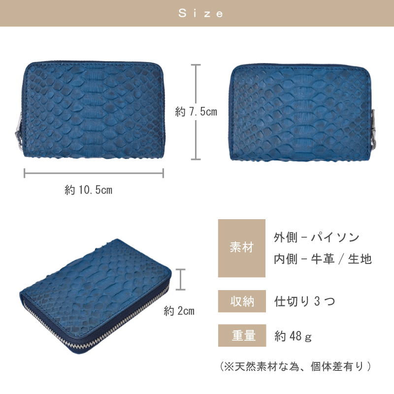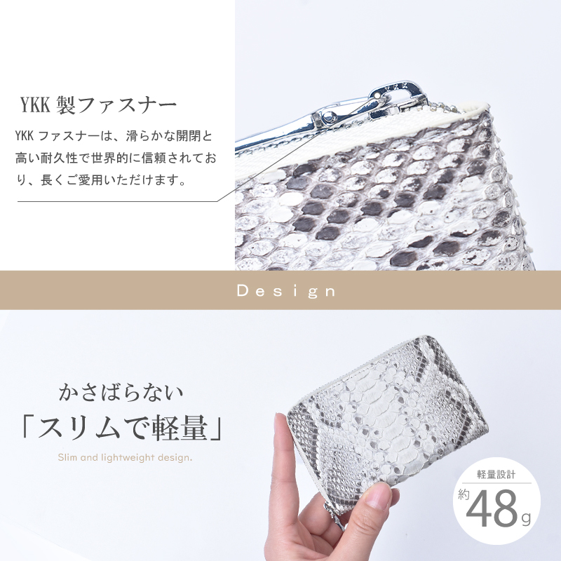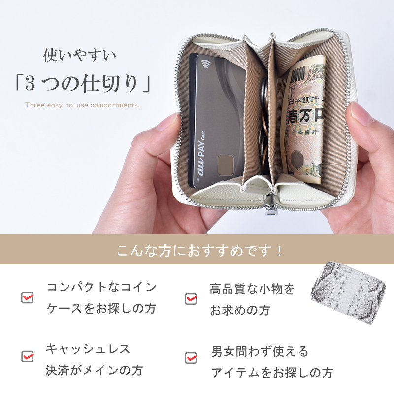| 特徴 | 3つの仕切りで使いやすい!蛇革コインケースが新登場♪ ●「美しいパイソン一枚革」 パイソンレザーは、その独特の美しい鱗模様と、使い込むほどに増す艶が魅力の高級素材です。 一枚革を贅沢に使用することで、継ぎ目のない美しい仕上がりと、天然素材ならではの風合いを存分にお楽しみいただけます。 ●使いやすい「3つの仕切り」 内側は3つの仕切りで構成されており、小銭はもちろん、カード類や折りたたんだお札まで、種類ごとに整理して収納できます。 必要なものをサッと取り出せるので、お会計時もスムーズ。 キャッシュレス決済がメインの方にも使いやすいデザインです。 ●「こんな方におすすめ」 ・コンパクトなコインケースをお探しの方 ・高品質な小物をお求めの方 ・キャッシュレス決済がメインの方 ・男女問わず使えるアイテムをお探しの方 ●コの字ファスナーで「大きく開口」 コの字に大きく開くので中身が隅々まで見渡せ、小銭やカードの取り出しが驚くほどスムーズ。 ●耐久性の高い牛革 内装の素材にもこだわり、側面には摩擦に強く耐久性の高い牛革を採用しています。 ●内側の生地 内側は軽量で滑りの良い生地を使用することで、全体の重さを抑えつつ、中のものが引っかかりにくくスムーズに取り出すことが可能に。 ●上品なシルバー金具 やや大きめのチャームで掴みやすく開閉がスムーズに行えます。 ●YKK製ファスナー YKKファスナーは、滑らかな開閉と高い耐久性で世界的に信頼されており、長くご愛用いただけます。 ●かさばらない「スリムで軽量」 コンパクトながらも収納力があり、手のひらに収まるちょうど良いサイズ感。 重さもわずか約48gと軽量です。 ●柄なしデザイン 「素材の上質さが際立つ」 パイソンのきめ細やかな質感や光沢がより際立ち、素材そのものの美しさを堪能できます。 ●柄ありデザイン 「蛇革の個性を最大限に」 パイソン本来の美しい鱗模様が際立ち、エキゾチックでワイルドな雰囲気を楽しめます。 ●男女兼用デザイン ・流行のミニバッグやクラッチバッグにも無理なく収納可能。 ・ズボンのポケットやジャケットの内ポケットにもすっきりと収まります。 ●必要なものだけを「スマートに持ち運ぶ」 小銭だけでなく、カードや折りたたんだお札も収納できるので、普段から現金を持ち歩かない方に最適です。 ●どのくらい入る?を検証 最大カード24枚、コイン20枚 ふくらみは出ますが、これだけ入れてもスッキリ収納出来ます。 ●幸運を呼び込む蛇革 『蛇の財布が金運をアップする』と言われるのは、蛇が古来から富や繁栄の象徴とされており、その皮が滑らかで 美しいため風水的にも金運を引き寄せると信じられているからです。 また、魔術的な信念やシンボリズムによって、蛇の皮で作られた財布が金運を増幅させると考えられています。 これらの理由から、蛇の財布が金運に良い影響を与えると信じられています。 【認証試験】 お客様に安心してご購入頂けるように、MGSABLEでは本革の認証試験を行っております。 【“革の表情”について、ご購入前にご確認下さい。】 本製品は蛇本革を使用しておりますので、キズやシワなども入っている場合がございます。 これらは本革ならではの個体差によるものと、2つとない表情を魅せる革の個性であるため、 風合いをお楽しみ頂けると幸いでございます。 ※ひどく目立つものは除いて、ある程度は革の個性としてそのまま出荷・発送致します※ ※上記のような革の個性による返品・交換は原則お受け致しかねますので、予めご了承下さいませ※ 【上記のような症状は使用する程に、徐々に革が馴染み目立ちにくくなっていきます。】 【エイジングについて】 パイソンの鱗の先端は反り返っているものがございます。これは、湿度などの変化によって起こる自然の状態です。 また、財布やバッグのカーブする部分は特に鱗が立ち上があります。これは「本物の証」であり、型押しレザーでは表現できない表情です。 また日常生活の中で、強い力で引っ張らないかぎり、鱗がめくれる事はありませんのでご安心下さい。 使用する程に革が馴染み、反り返りが少しづつ目立ちにくくなります。 経年変化で表情を徐々に変える。“革を育てる”そんな楽しみ方ができるレザーです。 【ラッピングサービス】 別途プラス200円でラッピングサービスを承ります。 ラピング【希望する】をご選択ください。 【保証】 万が一商品に不良があった場合の安心保証 10日間の商品保証 当社では全てのお客様に安心、ご満足してお買い物を楽しんで頂けるよう 『全額返金保証』『新品交換』を行っております。 万が一不具合があった場合でも、誠意を持ってご対応致します。 ●万が一商品に不具合がある場合、商品到着から10日以内であれば、送料を含め返金または交換をさせて頂きます。 ●お客様都合のご返品、交換希望の場合、送料をお客様ご負担とさせていただいております。 ※上記の