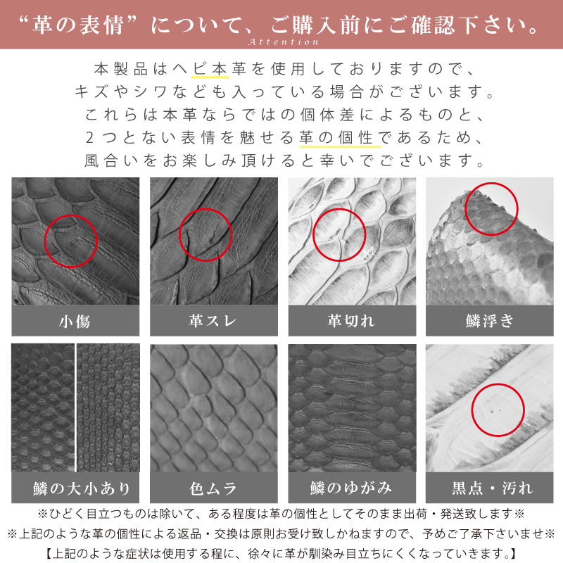 | その他詳細 | 天然皮革に関してはワシントン条約を元に適正に輸入された商品を販売しています。 撮影に使用された商品が届く場合がございますが、当店の運営に基づき、出荷時に問題の無いと判断し販売しております。 |