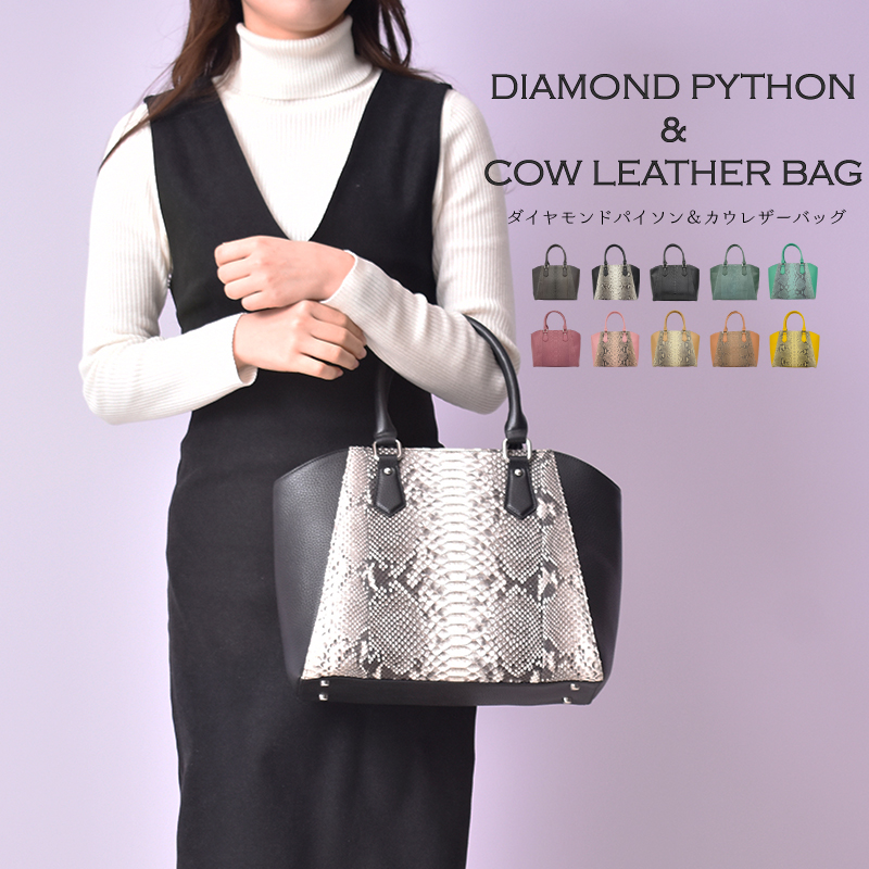 | 特徴 | 上品フォルムで収納力抜群!上品なパイソン&カウレザーのバッグが新登場! −Point1− 規則的に並ぶダイヤ形の美しい斑模様が魅力のダイヤモンドパイソン。 しっとりと優しい質感で、使うほどに艶が生まれ、色見に深みが増します。長年エイジングを楽しめるレザーです♪ −Point2− バッグの側面やハンドル部分は、丈夫で柔らかな牛革を使用。 高級感があり上品なので、普段使いはもちろんビジネスにもお使いいただけます! −Point3− 長財布やポーチはもちろん、A4サイズの雑誌やファイルも収納可能でお仕事バッグにもピッタリ♪ ついつい増えがちになる荷物でも、たっぷり収納する事ができます。 −Point4− カラーは定番色から華やかな色まで、全10色ご用意しました♪ 自分だけのお気に入りの色を見つけてください! −Point5− 内側にはオープンポケットが2つあり、取り出しやすく便利です。 片側にはファスナーポケットもあり、小さな財布やスマホの収納が可能! −Point6− 4か所の底画鋲つきで、しっかり自立可能です。 汚れ防止にも役立ちます! |
