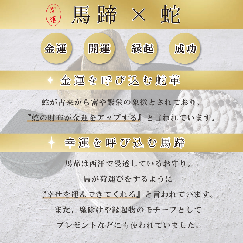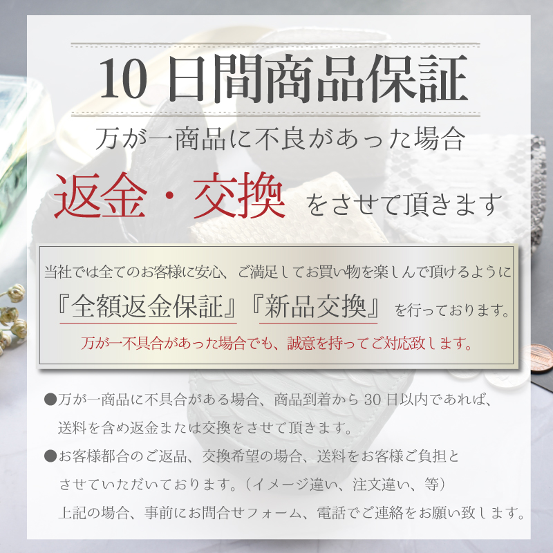 | 特徴 | 【パイソンマテリアル】 〜天然の優しい手触りと美しさ使うほどに美しい艶、色味に深みが生まれます〜 パイソンの特徴はこの個性的で美しいウロコ模様にあります。 ラグジュアリーな雰囲気があり、エキゾチックレザーならではの表情をお楽しみ頂けます。 繊細な見た目ではありますが、鱗が剥がれたりする事はありません。 使うほどに何とも言えない色味に深みが生まれ、艶が増していきます。 【美しく繋ぎ目のない一枚革】 本体前面と背面にかけて使用。繊細で美しい革の表情は型押しやプリントでは味わえません。 本物ならではの存在感をお愉しみください。 【ギフトに最適】 男女兼用デザインで年齢問わずお使い頂けます。ギフトにも最適。 ラッピングサービス(200円) 【模様について】 こちらの商品は天然素材を使用しておりますので、 斑模様がそれぞれ異なります。 模様を指定してのご注文は承っておりません。 お手元に届くまでお楽しみにしていただけますと 幸いでございます。 【“革の表情”について、ご購入前にご確認下さい。】 本製品は天然の素材を使用しておりますので、キズやシワなども入っている場合がございます。 これらは本革ならではの個体差によるものと、 2つとない表情を魅せる革の個性であるため、 風合いをお楽しみ頂けると幸いでございます。 ※ひどく目立つものは除いて、ある程度は革の個性としてそのまま出荷・発送致します※ ※上記のような革の個性による返品・交換は原則お受け致しかねますので、予めご了承下さいませ※ 使用する程に革が徐々に馴染み、目立ちにくくなります。 【金運UP】 馬蹄×蛇革 ・金運を呼び込む蛇革 蛇が古来から富や繁栄の象徴とされており、『蛇の財布が金運をアップする』と言われています。 ・幸運を呼び込む馬蹄 馬蹄は西洋で浸透しているお守り。馬が荷運びをするように『幸せを運んできてくれる』と 言われています。また、魔除けや縁起物のモチーフとしてプレゼントなどにも使われていました。 【保証について】 ※10日間商品保証※ 万が一商品に不良があった場合返金、交換をさせて頂きます。 当社では全てのお客様に安心、ご満足してお買い物を楽しんで頂けるように 『全額返金保証』『新品交換』を行っております。 万が一不具合があった場合でも、誠意を持ってご対応致します。 ●万が一商品に不具合がある場合、商品到着から30日以内であれば、 送料を含め返金または交換をさせて頂きます。 ●お客様都合のご返品、交換希望の場合、送料をお客様ご負担と させていただいております。(イメージ違い、注文違い、等) 上記の場合、事前にお問合せフォーム、電話でご連絡をお願い致します。 |