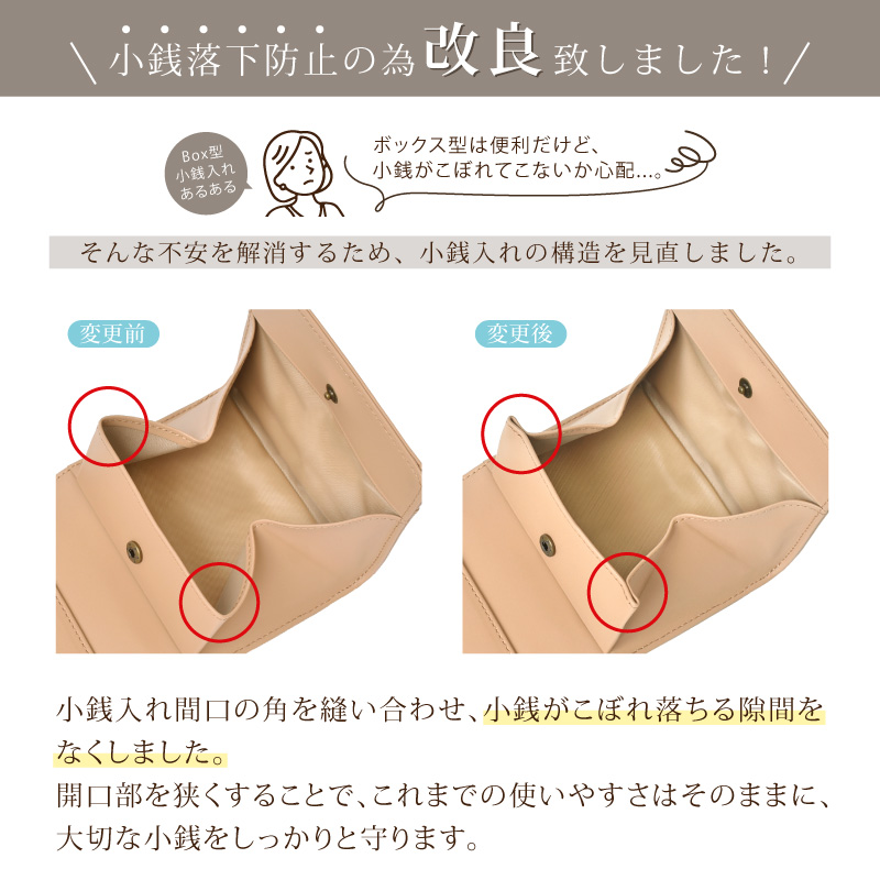 | 特徴 | パッと華やぐ大人カラー、本革の上質さを日常に。 選べて嬉しい13色 肌ざわりが良い牛革素材 さらっとした触り心地のなめらかなスムースレザーを使用。 表面に特殊なコーティングを施す事により、雨や汚れに強く、耐久性があります。 本革のマットな質感が上品さを演出します。 ●ガバッと見やすい!BOX型小銭入れ この折り財布の最大の特長は、BOX型の小銭入れです。 高さがあるため小銭がこぼれにくく、大きく開くので見やすく、出し入れもスムーズに。 ●6つのポケットに、スマート収納 外側と同じ牛革を使用し統一感のある仕上がりに。 内側には幅や深さに違いのあるカードポケットが6つあります。 スタンダードなクレジットカードサイズはもちろん大きめのスタンプカードも収納可能です。 ●広々設計で、出し入れ楽々。紙幣入れ(1カ所) ガバッと開いて見やすいお札入れ。仕切りはありませんが、その分ゆとりがあるのでスムーズに出し入れが可能。 コンパクトなのにお札を折らずに収納出来るのも嬉しいポイントです。 ●サッと取り出せる、裏カードポケット 裏側にもカードポケットが一箇所。ICカードや切符などを収納するにも便利。 ●スナップボタン開閉 ワンタッチで、スマート開閉。カード収納や小銭入れ部分の開閉には便利なスナップボタンを採用。 ●スキミング防止機能搭載 『目に見えないスリ』から情報を守るスキミング防止機能は現代社会のマスト機能です。 特殊なフィルムを革や生地の間に挟む事で外部からの電波干渉を防ぎます。 ●シンプルなデザインなので男女問わずお使いいただけます。 ●証明試験を行った牛革を使用しています。 お客様に安心してご購入いただけるよう、MGSABLEでは本革の証明試験を行っております。 ●“革の表情”について、ご購入前にご確認ください 天然のキズやシワなども入っている場合があり、これらは本革ならではの個体差によるものと、 二つとない表情を魅せる革の個性であるため、風合いをお楽しみ頂けると幸いでございます。 ※ひどく目立つものを除いて、ある程度は革の個性としてそのまま出荷・発送を致します。 ※上記のような革の個性による返品・交換は原則お受け致しかねますので、予めご了承下さいませ。 ●ラッピング承ります ご注文の際にラッピング希望『する』をご選択ください。 ※写真はラッピングイメージです。カラー・デザインは男女兼用の物でお包み致します。 |