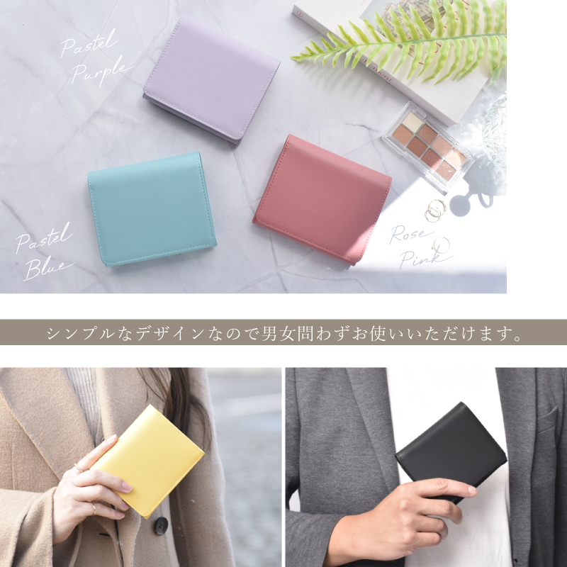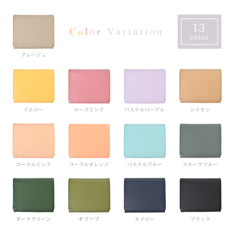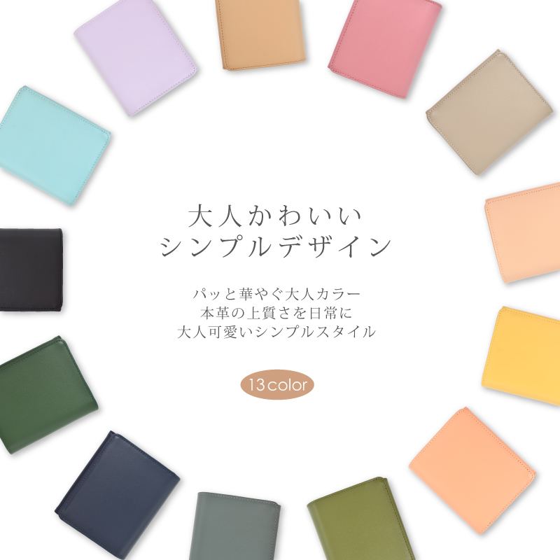 | 特徴 | パッと華やぐ大人カラー、本革の上質さを日常に。 選べて嬉しい13色 肌ざわりが良い牛革素材 さらっとした触り心地のなめらかなスムースレザーを使用。 表面に特殊なコーティングを施す事により、雨や汚れに強く、耐久性があります。 本革のマットな質感が上品さを演出します。 ●ガバッと見やすい!BOX型小銭入れ この折り財布の最大の特長は、BOX型の小銭入れです。 高さがあるため小銭がこぼれにくく、大きく開くので見やすく、出し入れもスムーズに。 ●6つのポケットに、スマート収納 外側と同じ牛革を使用し統一感のある仕上がりに。 内側には幅や深さに違いのあるカードポケットが6つあります。 スタンダードなクレジットカードサイズはもちろん大きめのスタンプカードも収納可能です。 ●広々設計で、出し入れ楽々。紙幣入れ(1カ所) ガバッと開いて見やすいお札入れ。仕切りはありませんが、その分ゆとりがあるのでスムーズに出し入れが可能。 コンパクトなのにお札を折らずに収納出来るのも嬉しいポイントです。 ●サッと取り出せる、裏カードポケット 裏側にもカードポケットが一箇所。ICカードや切符などを収納するにも便利。 ●スナップボタン開閉 ワンタッチで、スマート開閉。カード収納や小銭入れ部分の開閉には便利なスナップボタンを採用。 ●スキミング防止機能搭載 『目に見えないスリ』から情報を守るスキミング防止機能は現代社会のマスト機能です。 特殊なフィルムを革や生地の間に挟む事で外部からの電波干渉を防ぎます。 ●シンプルなデザインなので男女問わずお使いいただけます。 ●証明試験を行った牛革を使用しています。 お客様に安心してご購入いただけるよう、MGSABLEでは本革の証明試験を行っております。 ●“革の表情”について、ご購入前にご確認ください 天然のキズやシワなども入っている場合があり、これらは本革ならではの個体差によるものと、 二つとない表情を魅せる革の個性であるため、風合いをお楽しみ頂けると幸いでございます。 ※ひどく目立つものを除いて、ある程度は革の個性としてそのまま出荷・発送を致します。 ※上記のような革の個性による返品・交換は原則お受け致しかねますので、予めご了承下さいませ。 ●ラッピング承ります ご注文の際にラッピング希望『する』をご選択ください。 ※写真はラッピングイメージです。カラー・デザインは男女兼用の物でお包み致します。 |