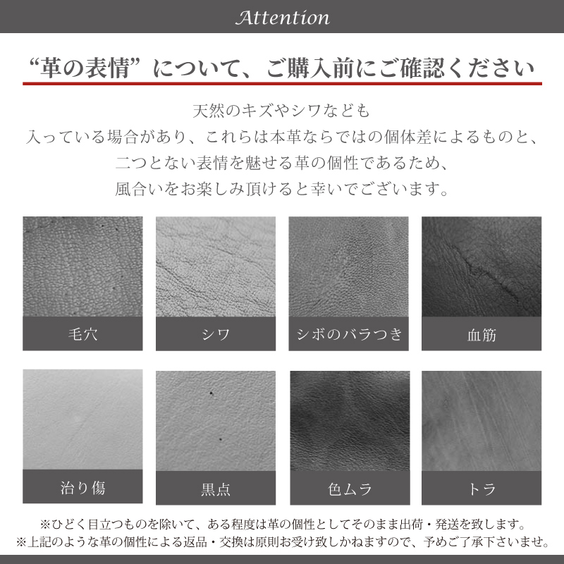 | 注意事項 | 当店で使用している本革は全て本物の革を使用しています。 その為、皮革の模様など掲載画面と異なる場合がございます。 ※ご覧頂いている商品の写真につきましては、できるだけ実物の色に近くなるように努めておりますが、 お使いの環境(モニター、ブラウザ等)の違いにより、色の見え方が実物と若干異なる場合がございます。※ ※掲載商品と色味、模様・柄が異なる理由などのイメージ違いで返品・交換の場合は、返送料お客様ご負担での返送をお願いしております。 予めご了承くださいませ。※ |