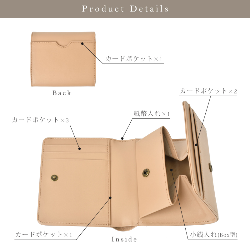 | スペック | 紙幣入れ×1 小銭入れ(BOX型)×1 カードポケット 内側×6 カードポケット 外側×1 |