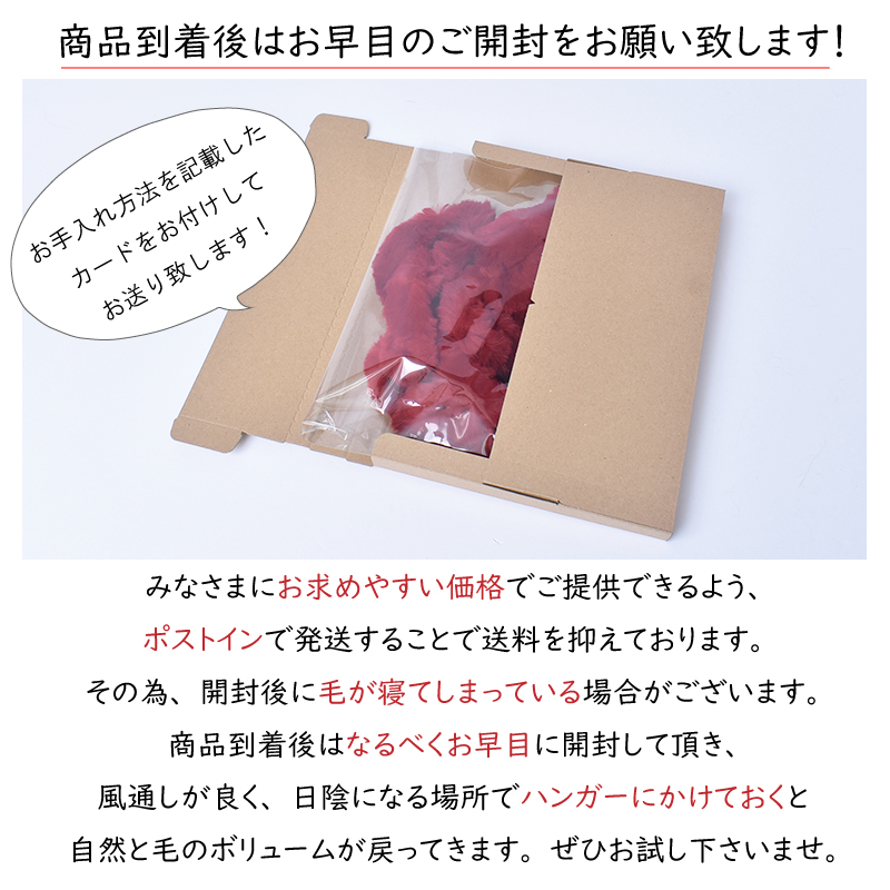 | 特徴 | 大人の女性の魅力を引き出す、洗練されたラビットファーマフラーが新登場♪ 一際目を引く、ドラマティックなレッドで冬の装いを華やかに。 ■柔らかく上質なラビットファー 柔らかく滑らかな手触りとボリューム感ある毛並みのラビットファー。 密度の高い毛質で保温効果が高く冬の寒い時期に適しています。 ■複数のデザインが連なるデザイン リング状のファーが連結したシンプルな中にも遊び心のあるデザイン。 リングに通す場所で多様な巻き方が可能です。 ■大人の魅力を引き出す、洗練された赤 とろけるような肌触りの赤色ラビットファー。 冬の装いを華やかに彩る、あなただけの特別な一品です。 ※商品到着後はお早目のご開封をお願い致します みなさまにお求めやすい価格でご提供できるよう、ポストインで発送することで送料を抑えております。 その為、開封後に毛が寝てしまっている場合がございます。 商品到着後はなるべくお早目に開封して頂き、風通しが良く、日陰になる場所でハンガーにかけておくと自然と毛のボリュームが戻ってきます。 ぜひお試し下さいませ。 お手入れ方法を記載したカードをお付けしてお送り致します。 |