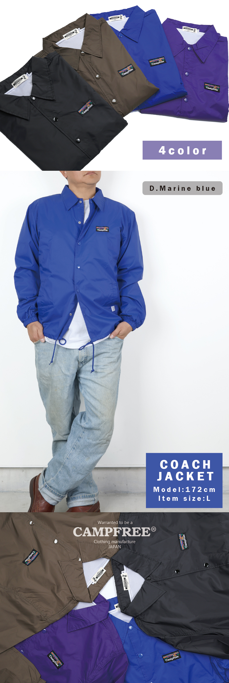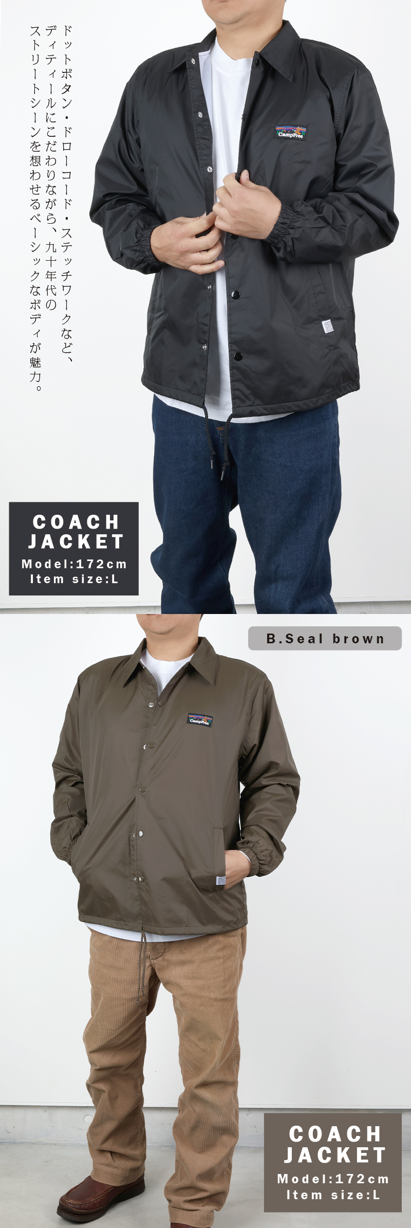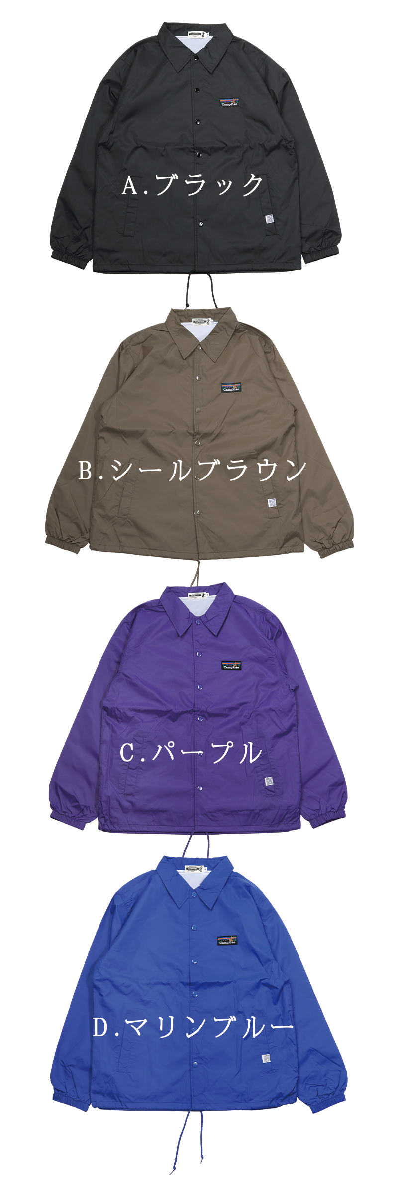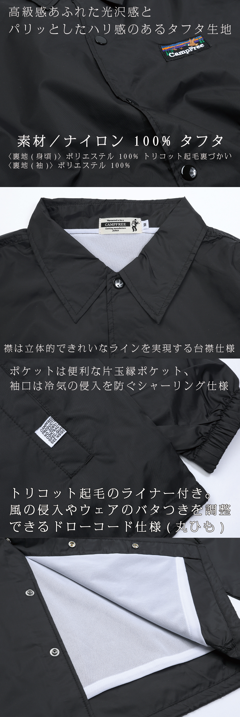 シンプルかつ定番スタイルのコーチジャケットです。パリッとしたハリ感のあるタフタ生地。裏地はトリコット起毛、裾はドローコード仕様。裾は風の侵入やウェアのバタつきを調整できるドローコード仕様。普段づかいだけでなく、もちろんチームウェアやユニフォーム用途にも。