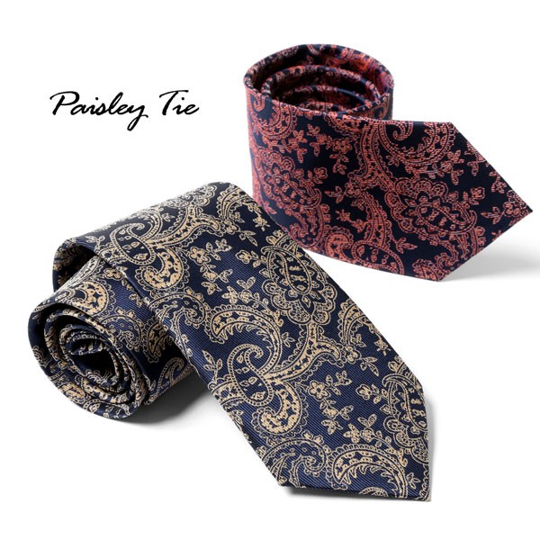 落ち着いたネイビーカラーの地に、大柄のペイズリー柄を大胆に施したネクタイ。