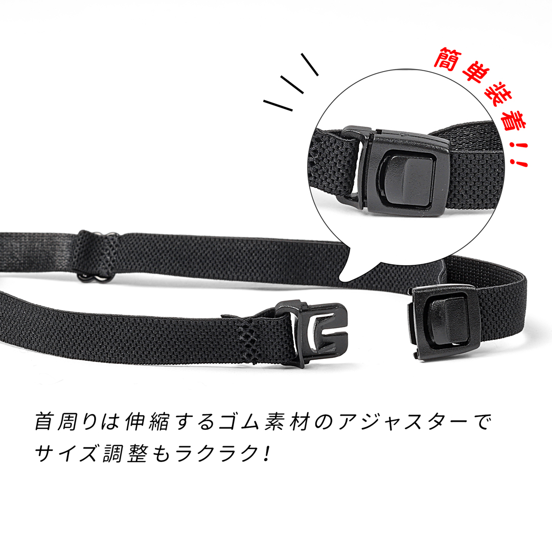 首周りは伸縮するゴム素材のアジャスターで、サイズ調整もラクラクです。