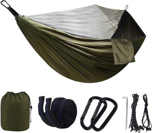 ハンモック 蚊帳付き 虫対策 パラシュート 通気 快適 軽量 4点セット 収納袋付き カラビナ付き 野営 ソロキャンプ ハイキング 蚊帳付きハン