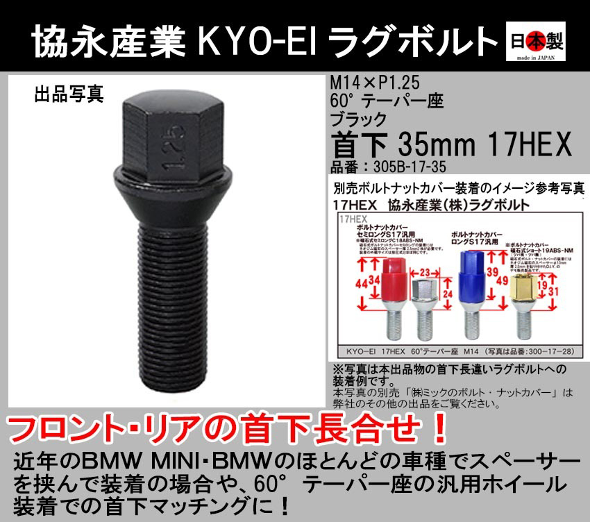 ◎◇ 格安 BMW MINI 協永産業 KYO-EI ラグボルト M14×P1.25 首下35 17HEX 袋 60°テーパー座 スチール 黒 日本製 305B-17-35 1個
