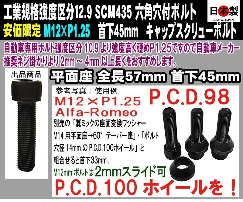 日本製 六角穴付 キャップスクリュー SCM435 M12 × P1.25 全ネジ 極細目 首下45mm 1個 アルファロメオ PCD変換 2mmスライド 座面変換