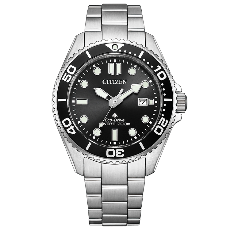 コンパクトなサイズ感と正統派のデザインにこだわった、エコ・ドライブ ダイバー200m。回転ベゼルは、外周全体にやや深めの溝を刻んだオーソドックスな仕上がりで、優れた操作性も実現しています。3連メタルバンドは、別体構造の中駒を用い、斜面をミラー仕上げにした立体感のある力強いデザイン。バックルは、ダイビングスーツを着用した際なども簡単に調整・装着できるラチェット付ダブルホールディングバックルを採用しています。中心から外側にかけてグラデーションを施した文字板は、深く澄んだ海中を表現。シンプルながらも高級感のあるフェイスに仕上げています。
