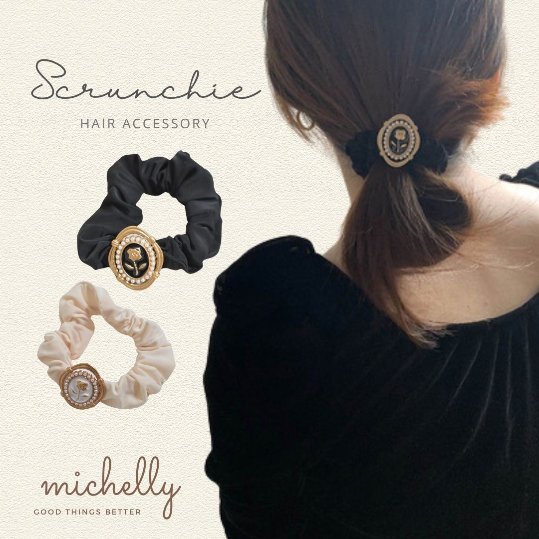 クラシカルで上品なカメオモチーフが目を引く、大人可愛いシュシュ。