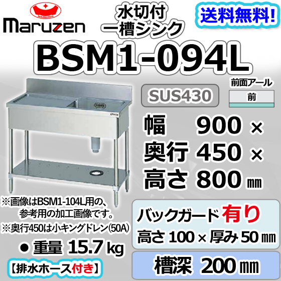 BSM1-094L マルゼン 1槽 一槽 水切付 シンク 業務用 ステンレス 流し台 幅900×奥行450×高さ800+バックガード100mm 新品 別料金にて設置入替回収等