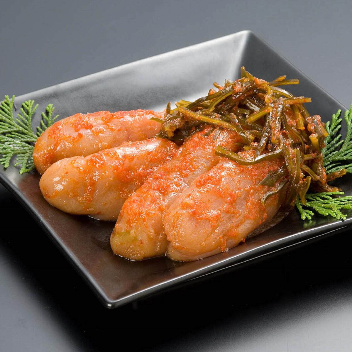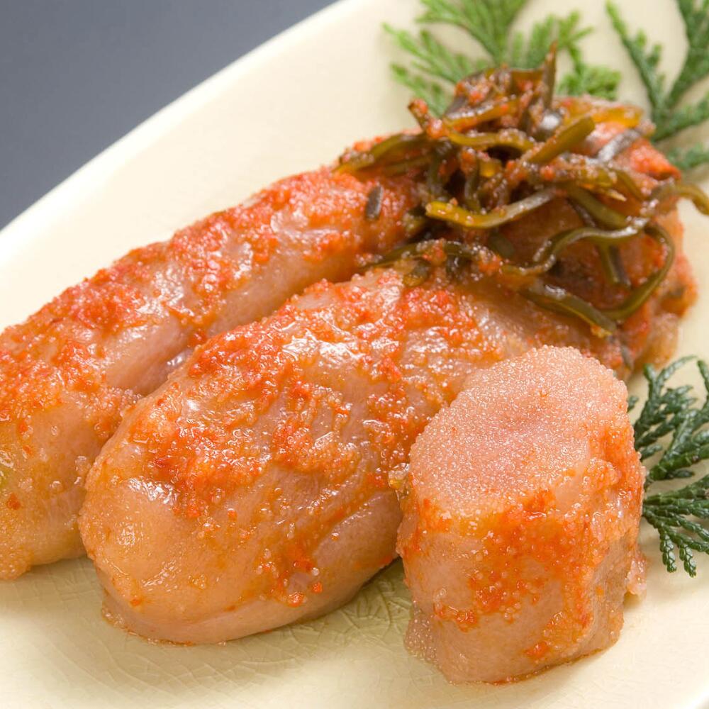 北海道で水揚げされた新鮮な『スケトウダラ』から取り出した成熟卵を着色料を使わずに塩と羅臼昆布のエキスを加えたオリジナル明太調味で漬け込み、1週間低温熟成させた後に別途明太調味で下味をつけておいた細切りにした函館産のがごめ昆布を加えたこだわりの明太子です。