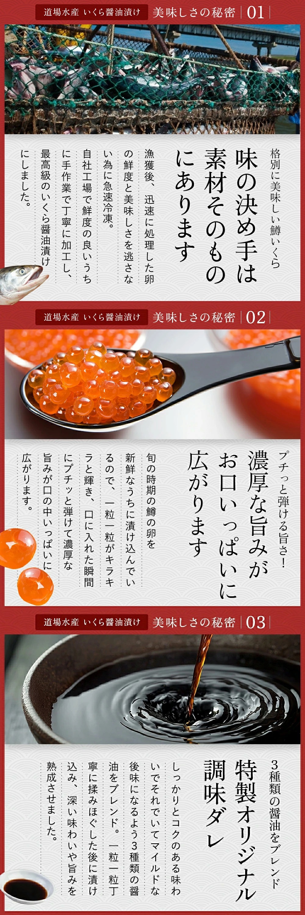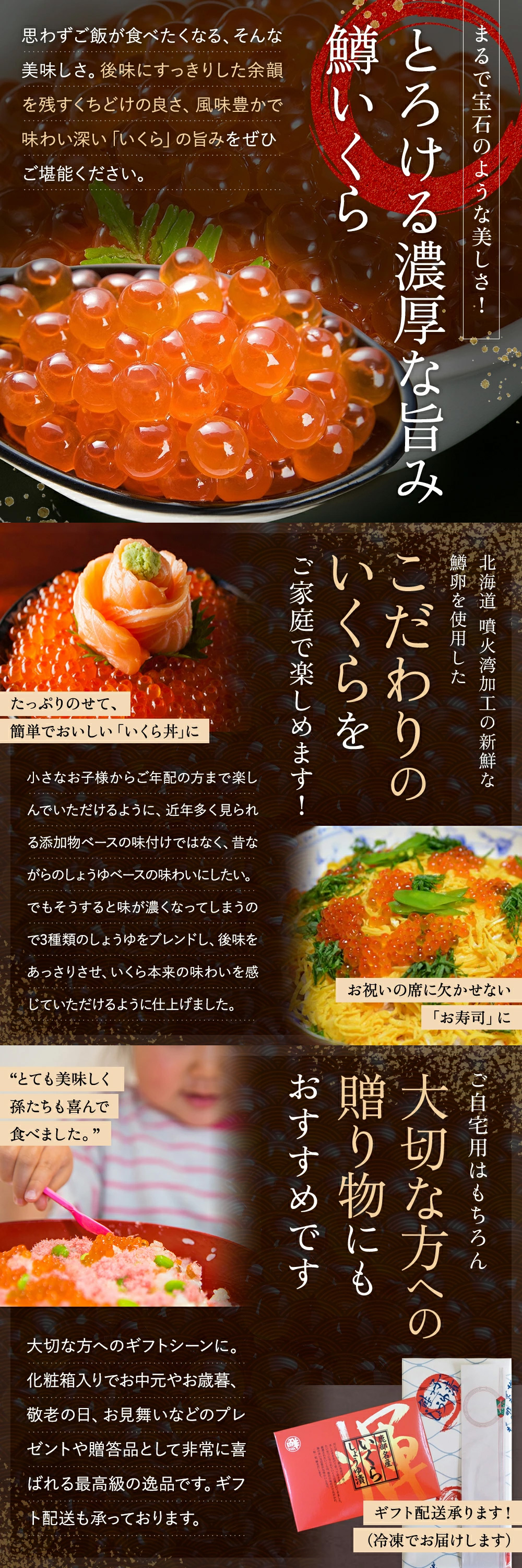 後味にすっきりした余韻を残すくちどけの良さ、味わいの深さが特徴の豊かな「いくら」の旨みをぜひご堪能ください。