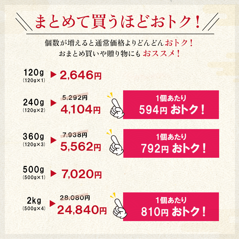 2kg、1.5kg、1kg、600g、500g、360g、300g、240g、120g