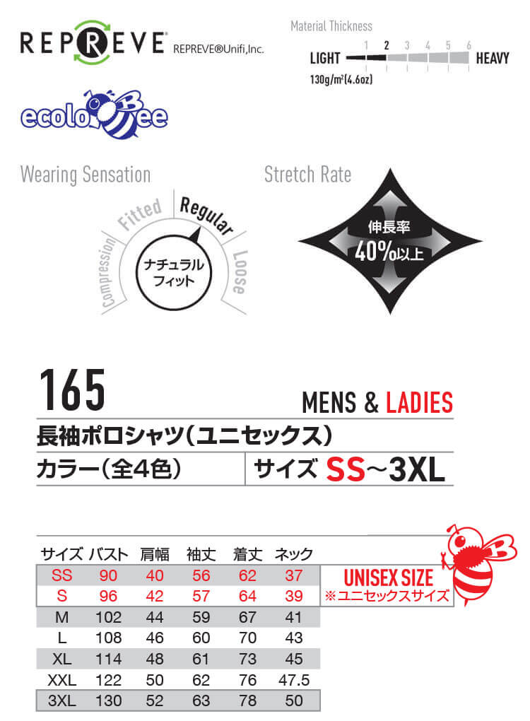 BURTLE バートル 長袖ポロシャツ 165 サイズSS〜XXL 作業着 男女兼用