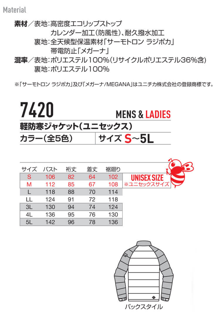 【2,000円オフクーポン】BURTLE バートル 軽防寒ジャケット 7420 サイズS〜3L エコ 防寒服 防寒作業着[即日発送]