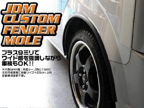 両面テープで装着するだけのウレタン製フェンダーモール。片側9mm幅(両面テープ含む)で両側装着でも20mm未満となるので車検時でも記載事項変更等の届出が不要です。カラーも光沢のあるブラックカラーで、硬質ウレタンのため、未塗装でも取り付け可能。