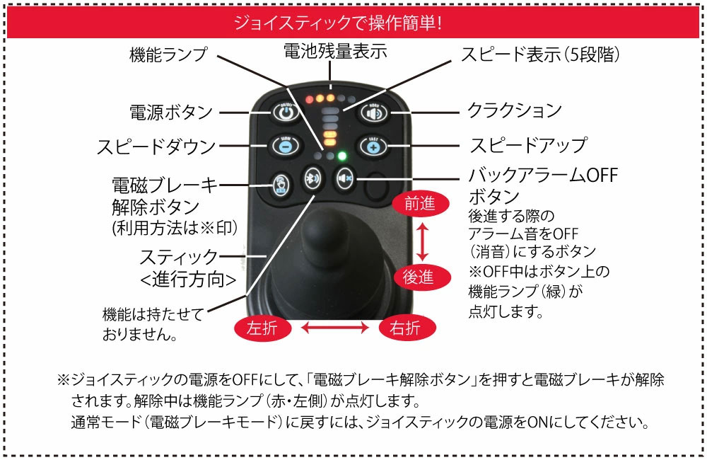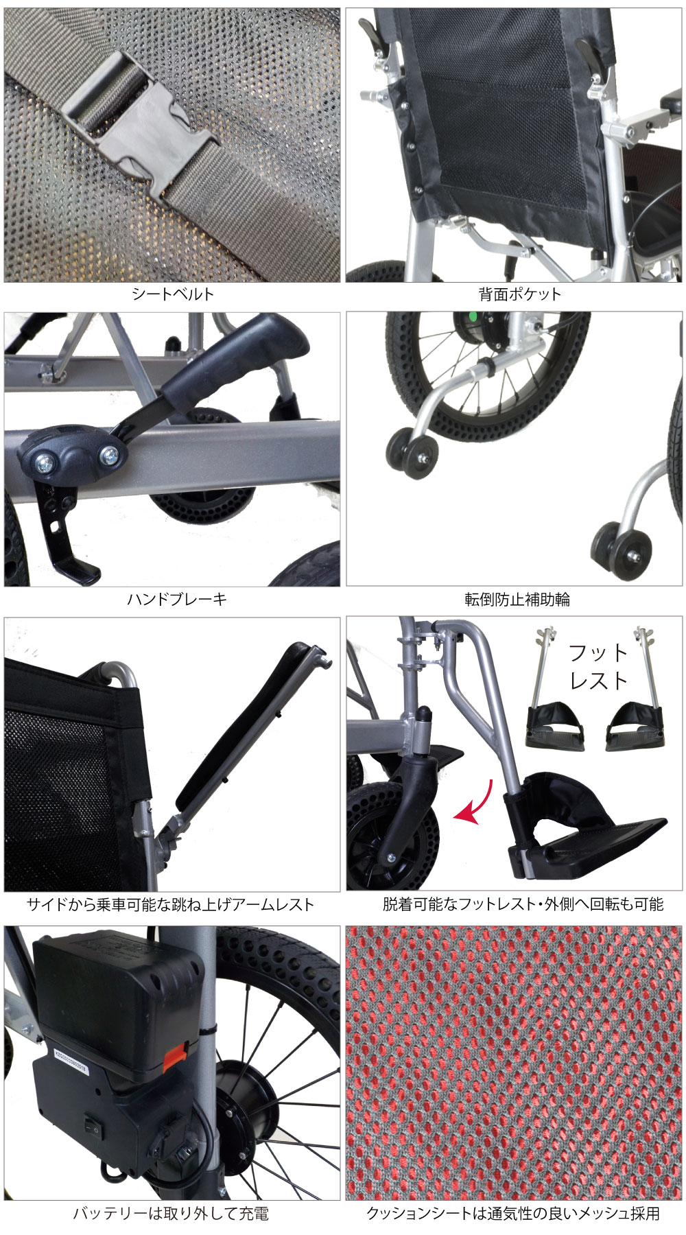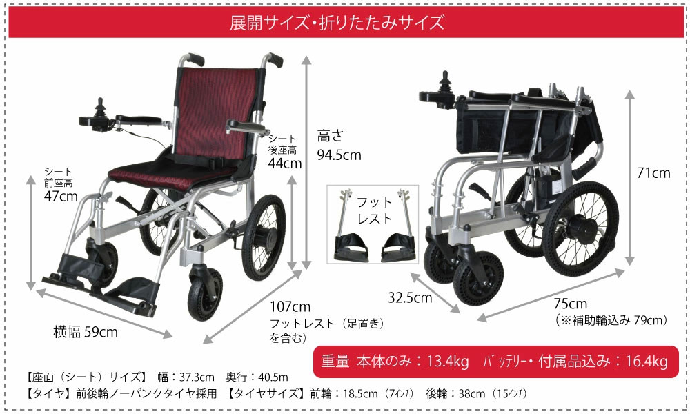| こちらの商品は、日本代理店(京都府)からお客様へ直送になります。 出荷前に全品整備点検した後でお客様へ発送いたしますのでご安心ください。 商品発送後、荷物の追跡番号および納品書&製品保証書を別便で当社から発行いたします。 商品は、半永久保証の対象商品となっております。詳しくは【こちら】をご覧ください。 保証期間中は、当店と代理店側でお客様情報を管理しておりますのでアフターサービスも万全です。 本体重量わずか約13.4kg!(バッテリー・クッション・ジョイスティック・フットレスト含む重量は約16.4kg) 強力なモーターを備えた機種としては世界最軽量レベルで、移動も車載も楽々! 手押しでも優しい設計、電磁ブレーキ解除でモーターの抵抗感ゼロ! 普通の車椅子と同じ感覚で押すことができます。 最初は慣れるまで低速で平坦な舗装された整地で練習しましょう。 コントローラーを前に倒せば前進。左に倒せば左旋回。右に倒せば右旋回。後ろに倒せばバックします。 バックする際は周囲へ注意喚起のため、音を発しながら後退します。 楽しく安全にお乗りいただくために、安全な場所で30分から1時間ぐらいの練習はしていただきたく事をお勧めします。 坂道を下る際はお好みのスピードに合わせて速度調整が出来るようになっています。 もし、坂道の途中で止まる場合は、ジョイスティックから手を離すか、スティックを中立にすれば自動的に電磁ブレーキが掛かるようになっています。 また、ジョイスティック上の操作ボタンで電磁ブレーキを解除することができます。 【仕様】 ■カラー: シートクッション・レッド生地に通気性の良いブラックメッシュ ■フレーム:シルバー ■座面(シート)幅:37.3cm 奥行:40.5cm ■本体フレーム:5000系アルミニウム合金 ■サイズ 展開時:長さ107cm・幅59cm・高さ94.5cm(全て約) 折りたたみ時:高さ71cm・幅75cm・厚み32.5cm(全て約) ■重量:約13.4kg(バッテリー・クッション・ジョイスティック・フットレストを含まない)、約16.4kg(バッテリー・クッション・ジョイスティック・フットレストを含む) ■タイヤ:前輪7インチ(18.5cm)・後輪15インチ (38cm)※前後輪ノーパンクタイヤ ■耐荷重:100kg ■素材 金属部:5000系アルミニウム合金 樹脂構成部:ポリアミド(ナイロン)+35%グラスファイバー ■バッテリー:25.9V/5.2AH×1個 リチウムイオン蓄電池内蔵 ■走行距離:満充電時、約15km(環境や走行路面状態によりかわります) ■充電時間:約5時間 ■登坂能力:約15度 ■適合電源:AC100-240V 50/60Hz ■消費電力:約134.68Wh ■最大速度:6km/h ■PSE(電気用品安全法)届け出済み 【介護保険対象商品】 TAISコード:01859-000008 ・ジョイスティックは左側にも設置できます。ご希望の方は、ご注文時に備考欄にご記入ください。 ・車いすは非課税で、消費税はかかりません。販売価格は、本体価格となっております。 <ご注意> ※こちらの商品は配達日時指定をお受けできませんのでご了承ください。 ※沖縄、一部離島への発送は行えません。予めご了承ください。 ※生産時期によっては、予告なく仕様変更されることがあります。 ※中国から直送の類似品にはご注意ください。 製品保証書は、ご購入後お客様の元に当社から別便で発行となります。 こちらの商品は、代理店による「半永久保証制度」を採用しております。 詳しくは【こちら】をご覧ください。 |