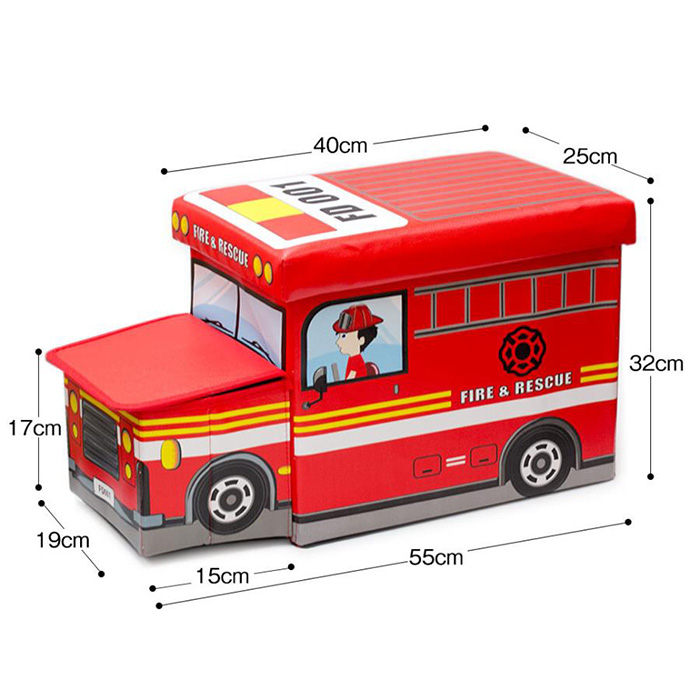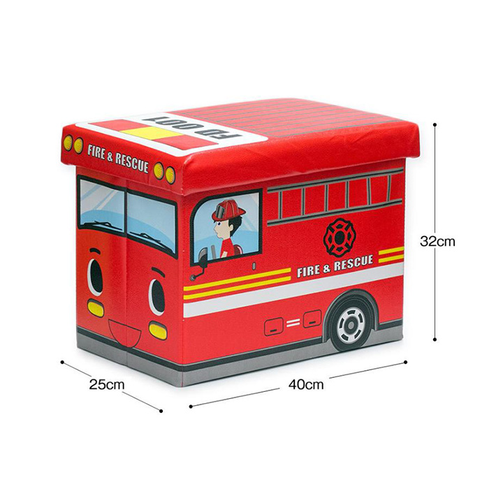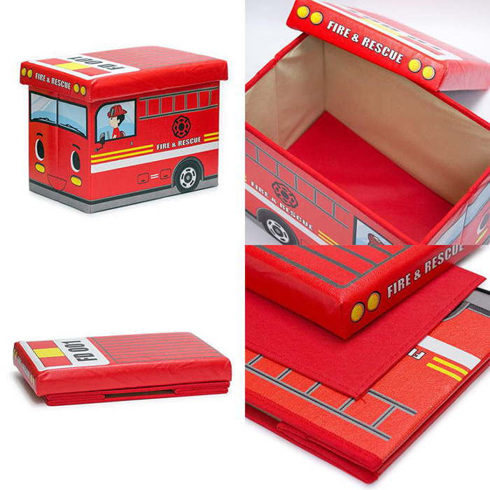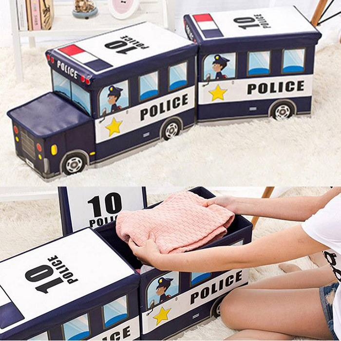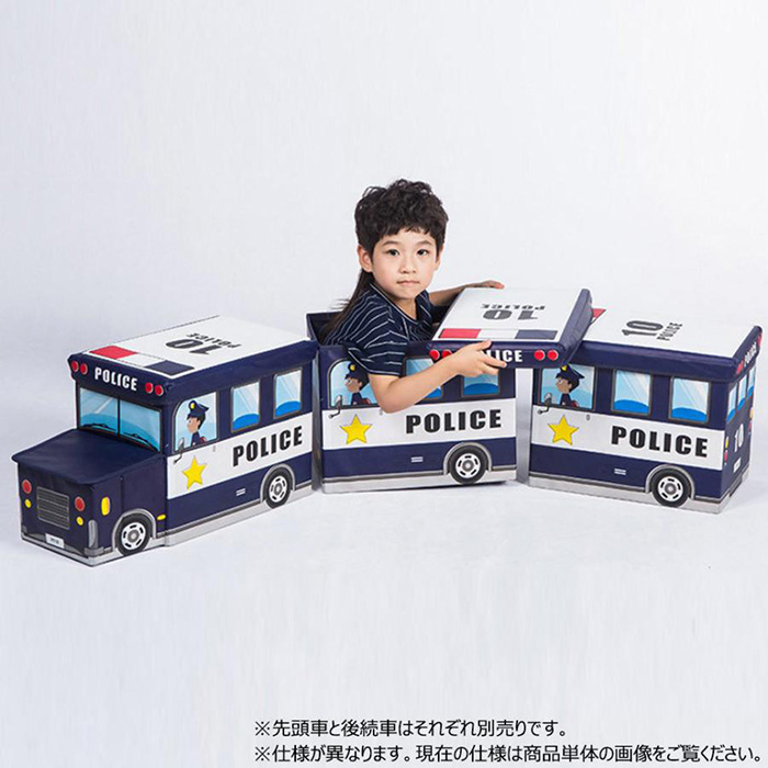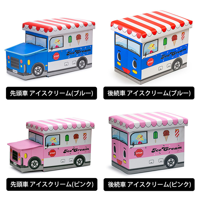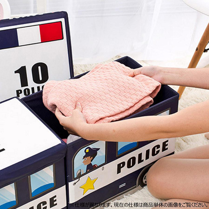 パトカー、消防車、スクールバス、アイスクリーム屋さんなどかわいらしい柄の簡易組み立て式収納箱です。