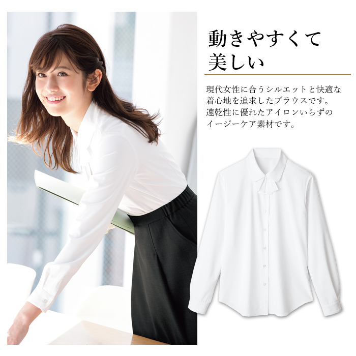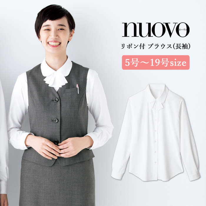 事務服 ブラウス レディース 長袖 制服 nuovo 秋冬 春 FOLK リボン付ブラウス 白 ホワイト 医療事務 受付 オフィス イージーケア おうちで洗える 送料無料