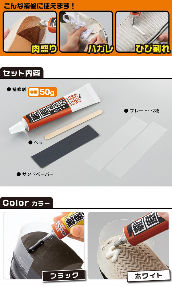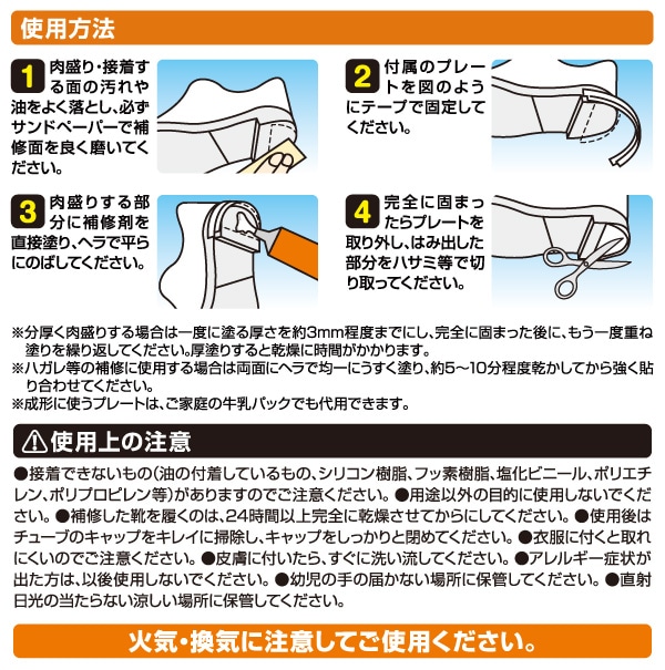 | 細口チューブで塗りやすい!ヒールや隅々の補修も簡単! 靴底のスリ減った部分の肉盛り補修、ハガレ・ヒビ割れの補修剤です。 まだ捨てるにはもったいない、そんな時に! お気に入りの靴を長持ちさせられます♪ ゴムや皮革への接着性に優れているので、ハガレ補修にも使えて便利◎ ■内容量:約50g ■成分:[溶剤]エチルシクロヘキサン66%、メチルイソブチルケトン34%、[材質]合成ゴム、[ヘラ]木、[サンドペーパー]紙、硅砂、[プレート]ポリプロピレン ■原産国:日本 ※こちらの商品はメール便発送となります。 厚みの関係でパッケージから出して袋に入れ替えて発送させていただきます。 予めご了承くださいませ。 |