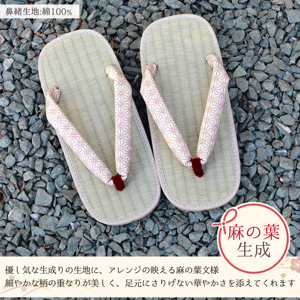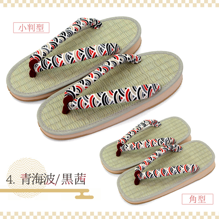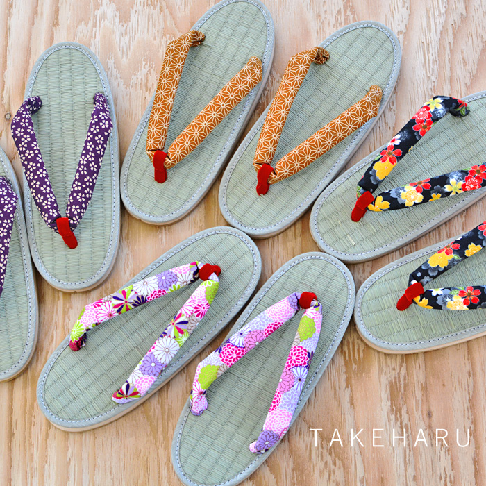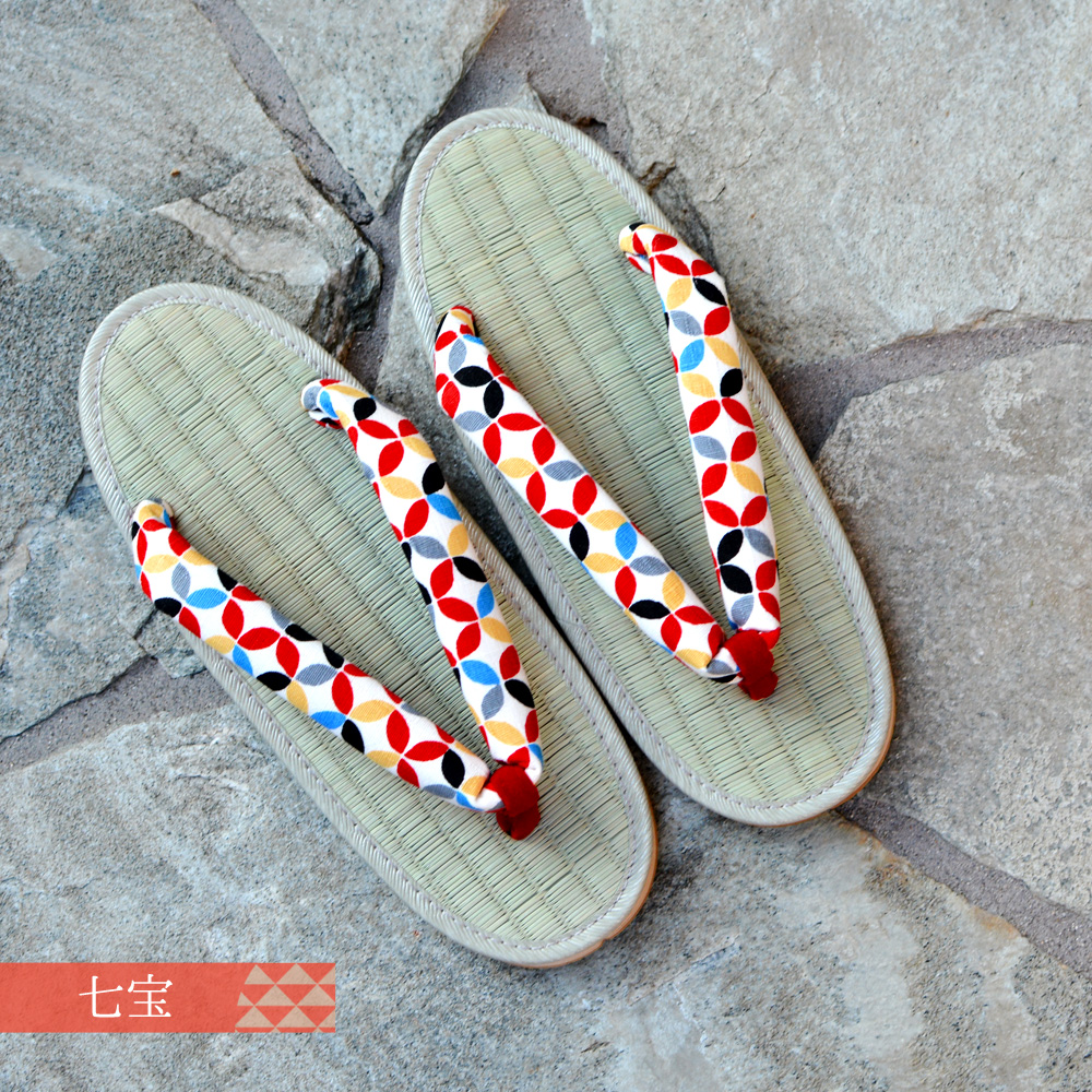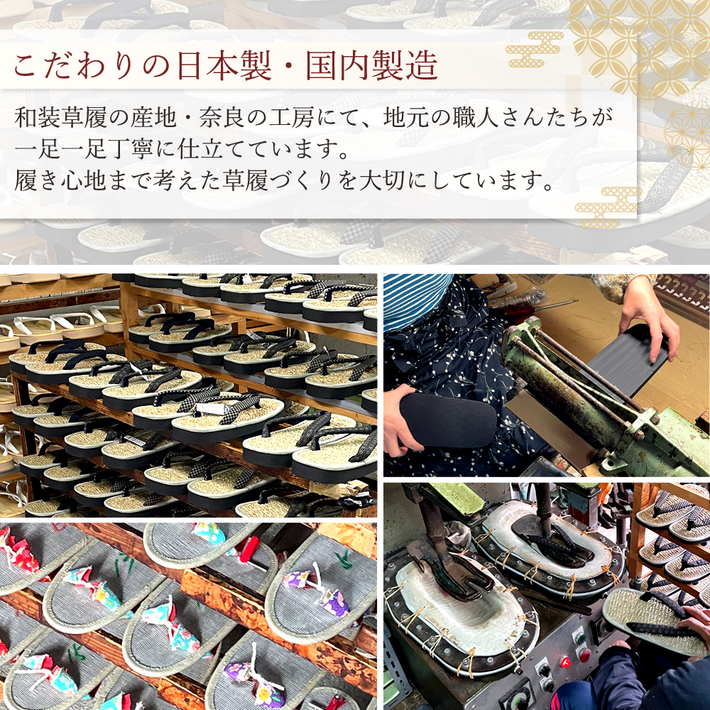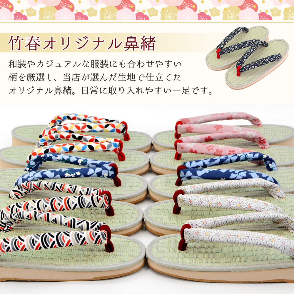 | 和装はもちろん、カジュアルな装いにもなじむ柄を厳選。 当店が選んだ生地で仕立てた、ここでしか手に入らないオリジナル鼻緒の雪駄です。 さらりと心地よいタタミ(い草)の天板は、一年を通して快適な履き心地。 通気性に優れ、足裏に熱がこもりにくく、蒸れにくいのも魅力です。 弾力のあるスポンジ底を採用しているため、足が痛くなりにくく、軽やかにお履きいただけます。 日本の職人が一足一足丁寧に仕立てた、細部までこだわりの詰まった一足です。 ■ブランド:竹春(TAKEHARU) ■生産地:日本 ■素材:[台]い草(畳)、[鼻緒]綿100%、[スポンジ部分]EVA ■サイズ(実寸) 縦×横、台のつま先から先坪(鼻緒)までの長さ 小判型M(標準):23.5×8.8、4cm 小判型L(大きめ):24.5×10、4cm 角型M(標準):23.5×10、4cm 角型L(大きめ):25×10、4cm すべて手作業での採寸のため、若干の誤差が生じる場合がございます。 ■適応サイズ 小判型:M(標準)22.5〜24.0cm、L(大きめ)23.5〜25cm 角型:M(標準)22.5〜24.5cm、L(大きめ)23.5〜25.5cm 雪駄はフリーサイズとなりますので、表記しているサイズは目安となります。 履き始めは鼻緒が窮屈に感じられますが、履き込むほど鼻緒が程よく伸び、足に馴染んできます。 【履き方のコツ】 雪駄を履く時は親指と人指し指の間に余裕を持たせ、かかとが少し飛び出るくらい浅めに履くと鼻緒で指の間を痛めにくいです。歩く際には重心が前になるように意識する事がコツです。 【サイズ選びのポイント】 雪駄は本来、かかとを少し出して履くのが一般的な履き方とされております。 履いていてかかとが痛くないほどの出方がちょうど良いサイズです。 足全体が台に乗った方が楽な方もいらっしゃいますので、ご自分のスタイルに合ったサイズをお選びください。 【長く使うためのコツ】 雪駄には左右がありませんので、時々左右を履き替えて頂くと長持ちします。 <ご注意> ・大きな布から型をとっておりますので、画像と柄の位置が若干異なる場合がございます。仕様となりますのでご了承くださいませ。 ・商品は防水されておりません。カビなどの原因となりますので、雨天時はご使用をお控えください。 ・鼻緒の裏面に色が付いている物は色移りする場合がありますのでご注意ください。 ・モデル着用写真は屋内外での撮影の為、光の影響で実際のカラーとは異なる場合がございます。 カラーバリエーションの画像が実物に最も近いお色味です。 |
