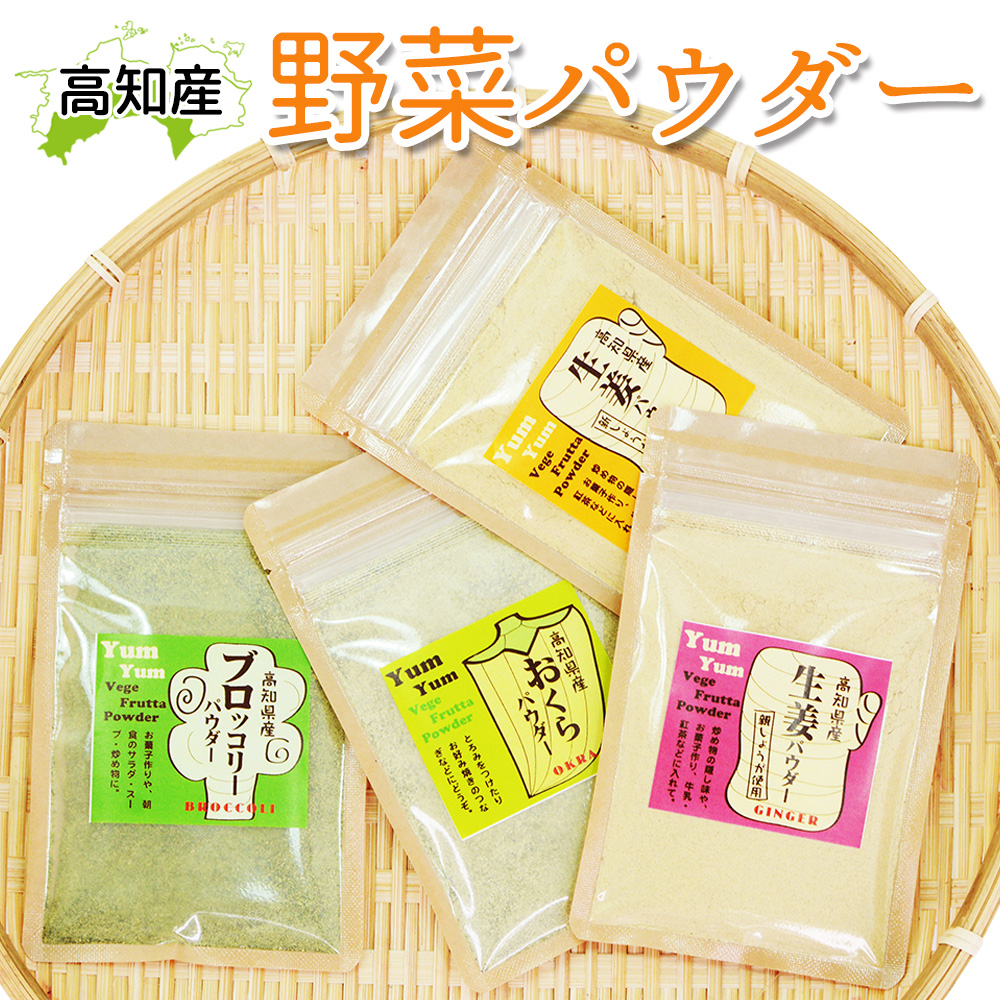| 【生産者「カトレア」さんご紹介】 こちらの商品は、当社の御座います高知市のお隣り、高知県は土佐市「カトレア」さんの商品です。 高知県産100%の乾燥野菜粉末を使用し、素材の特性を活かして丁寧に作り上げました。 カトレアさんは高知県版HACCP第3ステージに認証されている施設です。 こうちSDGs推進企業にも登録されており、ISOや有機JAS、ノウフクJASを取得するなど食の安全にも力を入れております。 【高知県は農産物の宝庫】高知県は、北は四国山脈、南は広い太平洋に面し、沖に流れる暖流黒潮の影響から、温暖で日照時間が多いという高知県の特徴を活かして、農業が盛んで「園芸王国」とよばれています。 日照時間と降雨量が全国トップクラス!雨量が全国的にも多いので、人には住みにくい気候でも野菜果物にとっては恵みの雨、強い日差しを浴びて野菜果物がぐんぐん育ちます! 今や全国的にその名を轟かせている清流四万十川、水質日本一にもなり「仁淀ブルー」で有名な仁淀川など、数多くの清流で知られています。 川の流域には工場が少なく水質は奇麗で、森林面積が日本一の高知県は空気がとても綺麗!良質な環境で育ったこれら野菜から野菜パウダーが生まれました。 どうぞご賞味くださいませ。 【生姜パウダー/親生姜】 商品名:親生姜 粉末 原材料名:生姜(高知県産) 内容量:30g 賞味期限:製造から半年 保存方法:高温多湿を避け保存 生産者:社会福祉法人土佐厚生会 就労継続支援B型事業所カトレア 高知県土佐市波介1237 栄養成分表示 100gあたり エネルギー:365kcal タンパク質:7.8g 脂 質:4.9g 炭水化物 :75.5g 食塩相当量:0.8g ※この表示は目安です。 高知県産の農産物を100%使用し、添加物不使用です。 親ショウガは生姜特有の風味辛みがよく感じられます。 【生姜パウダー/新生姜】 商品名:新生姜 粉末 原材料名:生姜(高知県産) 内容量:30g 賞味期限:製造から半年 保存方法:高温多湿を避け保存 生産者:社会福祉法人土佐厚生会 就労継続支援B型事業所カトレア 高知県土佐市波介1237 栄養成分表示 100gあたり エネルギー:365kcal タンパク質:9.6g 脂 質:3.2g 炭水化物 :70.6g 食塩相当量:0.8g ※この表示は目安です。 高知県産の農産物を100%使用し、添加物不使用です。 新ショウガは辛みさわやかですっきりしています。 【おくらパウダー】 商品名:オクラ 粉末 原材料名:オクラ(高知県産) 内容量:40g 賞味期限:製造から半年 保存方法:高温多湿を避け保存 生産者:社会福祉法人土佐厚生会 就労継続支援B型事業所カトレア 高知県土佐市波介1237 栄養成分表示 100gあたり エネルギー:286lcal タンパク質:18.2g 脂 質:0.9g 炭水化物 :66.0g 食塩相当量:0.1g ※この表示は目安です。 【ブロッコリーパウダー】 商品名:ブロッコリー 粉末 原材料名:ブロッコリー(高知県産) 内容量:40g 賞味期限:製造から半年 保存方法:高温多湿を避け保存 生産者:社会福祉法人土佐厚生会 就労継続支援B型事業所カトレア 高知県土佐市波介1237 栄養成分表示 100gあたり エネルギー:276kcal タンパク質:36.0g 脂 質:4.2g 炭水化物 :43.5g 食塩相当量:0.1g ※この表示は目安です。 高知県産の農産物を100%使用し、添加物不使用です。 ブロッコリーパウダーは料理などに入れる事で、食事と一緒に手軽にブロッコリーを食べることが出来ます。 高知県産の農産物を100%使用し、添加物不使用です。 オクラパウダーは水分を加えると特有の粘りが戻ります。スープや食事にとろみをつける事が出来ます。 【2503r】 |