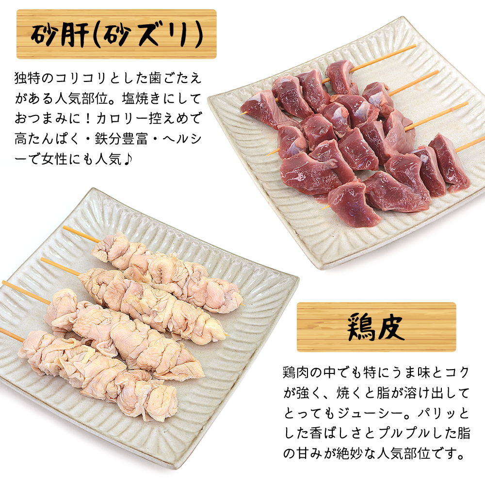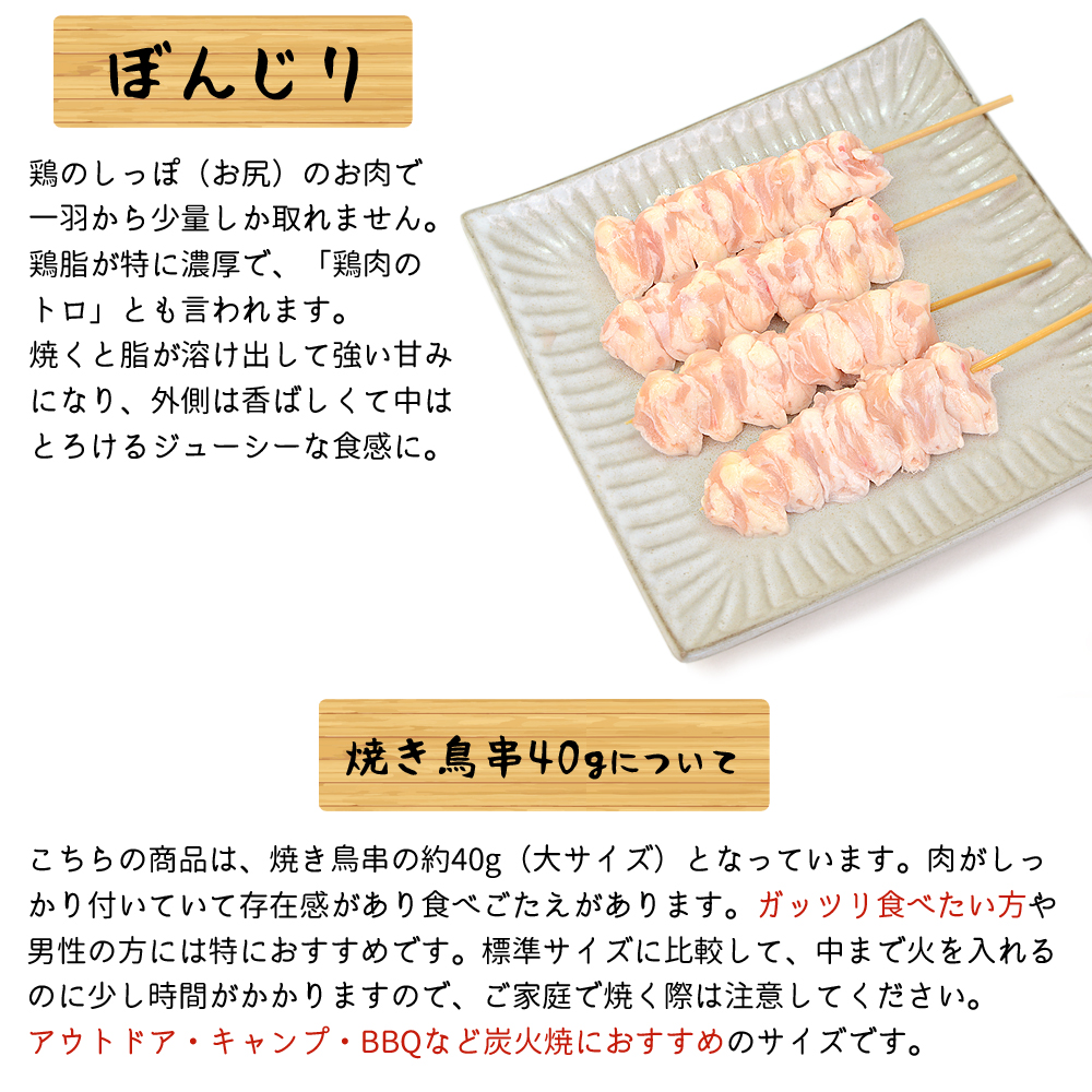 【焼き鳥串40gについて】 こちらの商品は、焼き鳥串の約40g(大サイズ)となっています。肉がしっかり付いていて存在感があり食べた感・満足感がございます。ガッツリ食べたい方や男性の方には特にお薦めです。標準サイズに比較して、中まで火を入れるのに少し時間がかかりますので、ご家庭で焼く際は注意してください。アウトドア・キャンプ・BBQなど炭火焼にはお薦めのサイズです。焼く前には、半日から一晩程度、冷凍庫から冷蔵室に移動するなど、ゆっくり時間をかけて解凍することがポイント!袋のままか、お皿に移してラップをして冷蔵庫に移してください。お急ぎの場合は、袋(密封)のまま、ボウルで流水に30分程度当てて解凍してください。タレ焼する場合は、火が通ってからタレを絡めて2〜3回お好みで塗り焼きしてください。タレ焼は焦げやすいので注意してください。また、塩焼きの場合、焼く直前にお塩で味付けし、焼き上がり時にも追い塩を少々!お好みで七味や山椒・レモン汁等で香り付けしてお召し上がりください。なお、ご家庭のコンロやグリルで焼く場合、串も一緒に焼けてしまうので、串の部分はアルミホイルでカバーしてくださいね。