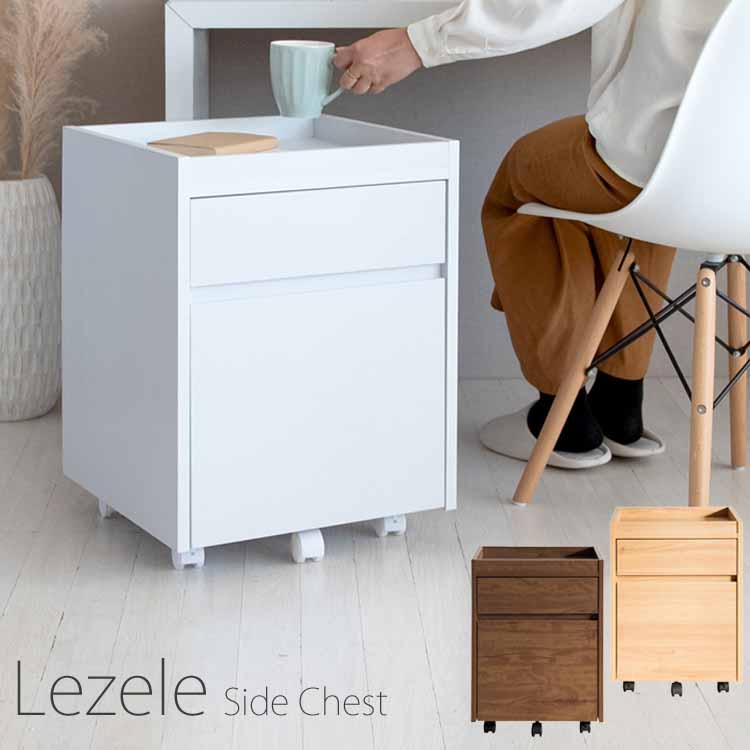 色々収納できる引き出しが二杯付いたシンプルで美しい木目調のサイドチェスト『Lezele(ルゼル)』。デスク周りはもちろんリビングや寝室などお家の色々な場所でマルチに活躍します。