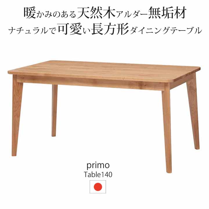 | プリモ ダイニングテーブル140 限られた空間を生かすコンパクトデザイン。 温かみのあるアルダー材で家族と一緒に過ごす安らぎのある暮らし。 深みのあるナチュラル色や素材の持つ風合いが特徴の天然木アルダー集成材を使用しています。 |