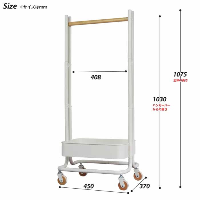 収納バスケットには、ランドセルが収納できるサイズと、上部のハンガー部分には子供服がちょうど収まりの良い高さになっております。