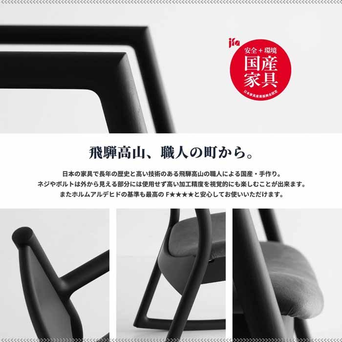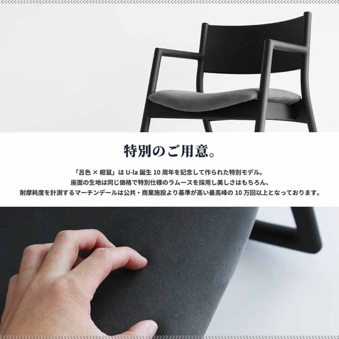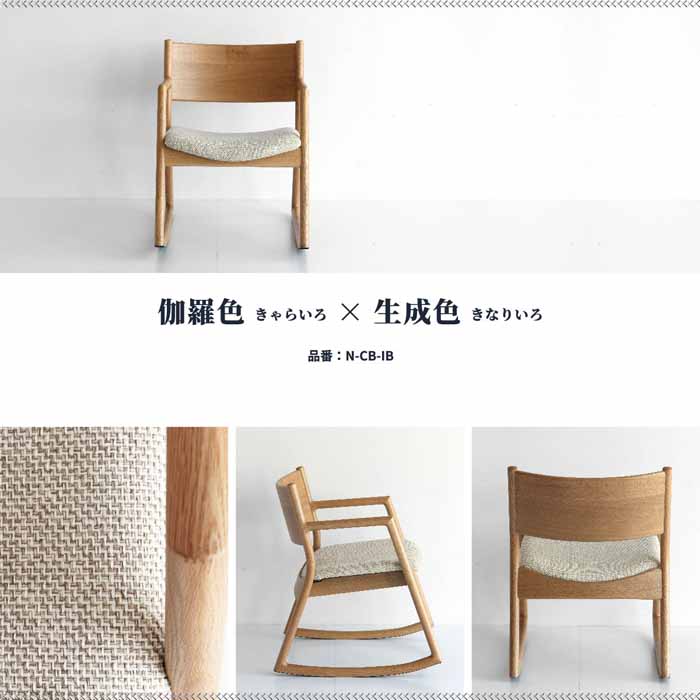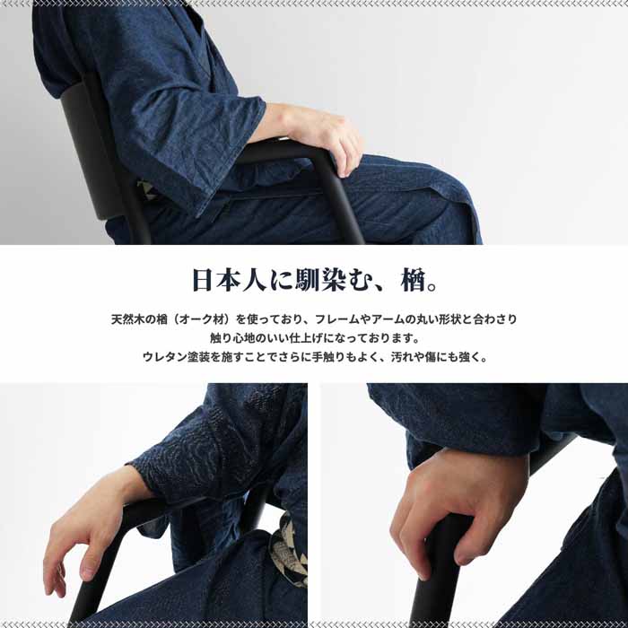 | 主材:天然木オーク材 / ウレタン塗装 呂色 × 紺鼠 / 座面:ラムース:ポリエステル88%、ポリウレタン12% 伽羅色 × 生成色 / 座面:バトン:ポリエステル100% 伽羅色 × 白練 / 座面:ラルゴ:合成皮革 材質基準:F☆☆☆☆ |