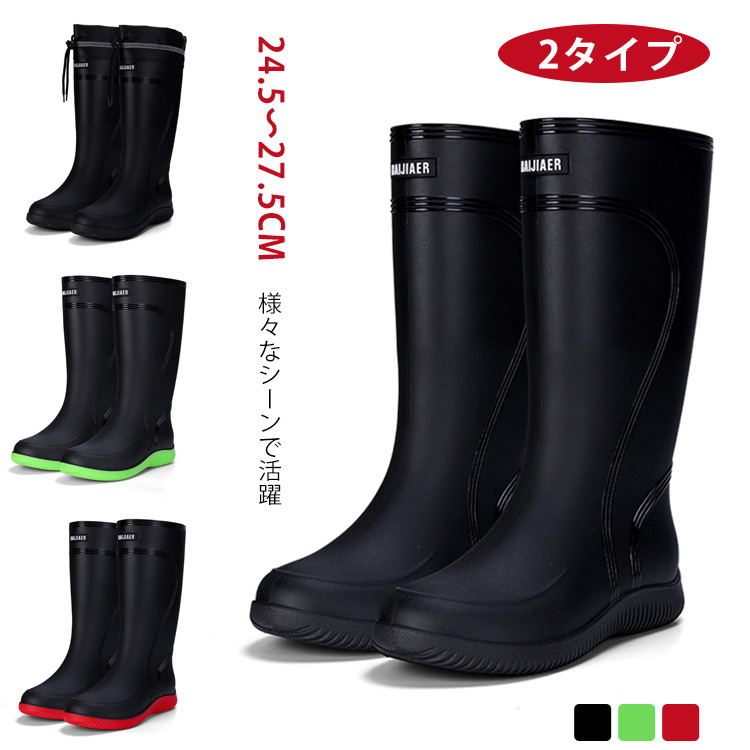 | 【2タイプ】【24.5〜27.5cm】 様々なシーンで活躍 普段使いもできるデザイン 農作業、ガーデニング、キャンプ、釣りなど、アウトドアでも活躍。 履き口部分はゴム入りで、絞る事ができる。 上からも水が入らない 脚にフィットさせれば、雨や泥が入らない。 凹凸のあるソールで滑りにくい 柔らかく、足も疲れにくい。 | |