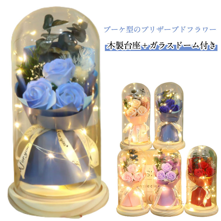 | ブーケ型のプリザーブドフラワー。【木製台座+ガラスドーム付き】 【いつまでも綺麗なお花を捧げたい・・・】・色彩豊かなプリザーブドフラワーをガラス容器に閉じ込めた「ガラスドームアレンジメント」【プリザーブドフラワーって?】・本物の生花を鮮やかな色彩のまま加工したもので、生花より長期間美しさを鑑賞できるのが特徴。 【生花の美しさと質感がそのまま】・季節ごとに咲く花々を、生花のみずみずしい質感はそのままに透明なドームの中にギュッと凝縮。 【水やりやお世話は不要】・ガラスドームで覆われているので、お花がホコリで汚れる心配がなく、水やりや水換えも一切不要。 【仏壇のお手入れも手間いらず】・お花が枯れずに長持ちするため、仏壇の前棚(ぜんだな)や経机を汚さずにいつでも清潔。 【ナチュラルな木製台座】・清潔感溢れる白木の台座とシックな黒色の台座。仏壇や雰囲気に合わせて自在にコーディネート。 【大切な方の好きなお花を】・季節の風物詩を、気持ち華やぐ彩りで。お気に入りの花が凛と咲き誇る、種類豊富なラインナップ。 【故人の面影に寄り添う彩り】・お供えする人の心もホッと安らぐ。故人を偲ぶ気持ちに寄り添う、温もり溢れるアレンジメント。 | |