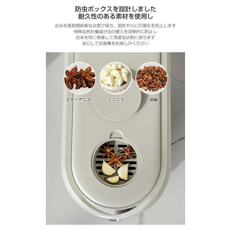 「虫除けボックス付き」スターアニス、脱酸素剤、ニンニクなどを入れて、湿気や害虫から保護します。