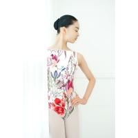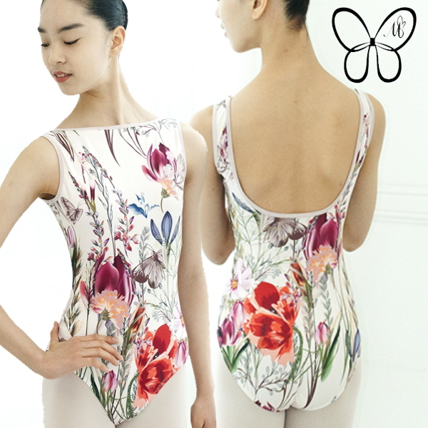 自然をイメージした明るいボタニカルが前面にプリントされた大人ボートネックレオタード