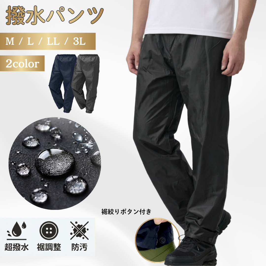 撥水パンツ・撥水加工を施した軽量ナイロンパンツ・ポリエステル100%生地で水をはじきやすい・通勤・通学時の急な小雨や風よけ、防寒対策に便利・軽量でコンパクトにたためるため持ち運びしやすい・旅行用のサブパンツや防災バッグ用としてもおすすめ・裾ボタン付きで絞ることで自転車のチェーン巻き込みを防止・裾を絞ることで風の侵入を軽減・野外作業やアウトドアでも快適に着用可能【注意事項】※本製品は防水ではありません。■カラー:ネイビー /ブラック■素材:ポリエステル100%撥水(水をはじきやすい)加工素材■SIZE(cm) 胴囲M :約72〜80cmL :約78〜88cmLL:約86〜96cm3L:約94〜104cm※モニター環境の違いにより実際のカラーと異なる場合がございます。
