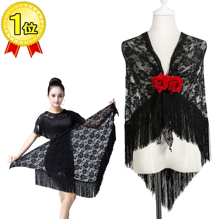 フラメンコ衣装 シージョ【 レース黒×フリンジ黒】マントン ヒップスカーフ ダンス衣装 ミカドレス cy267-pa