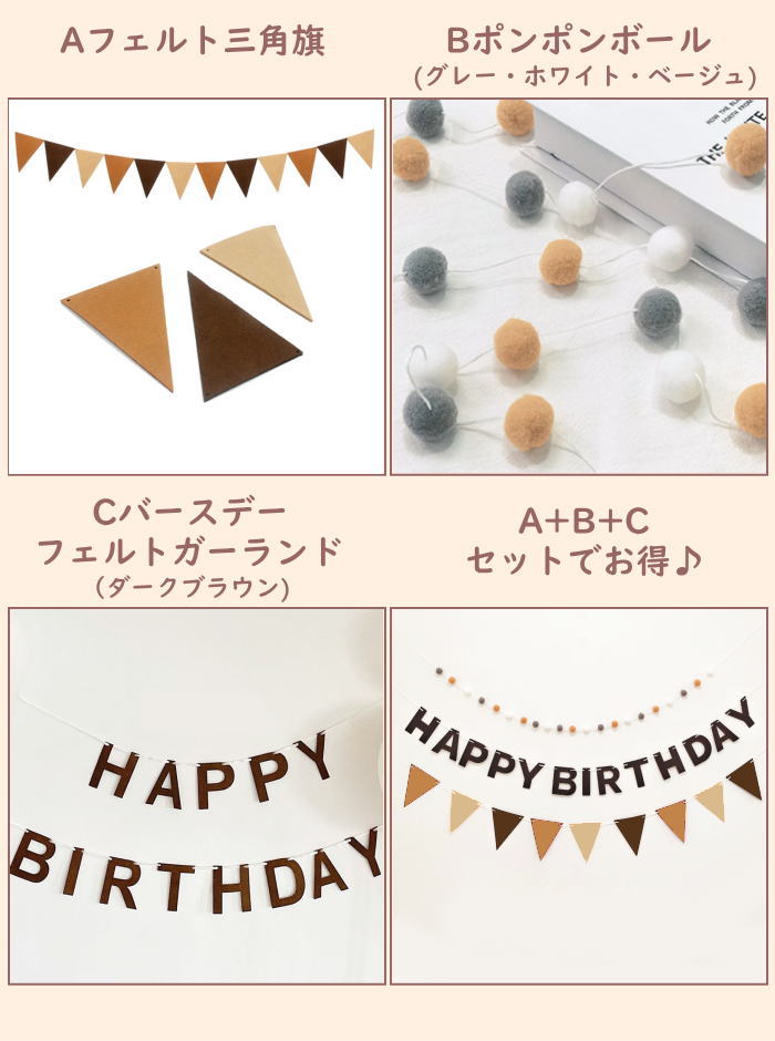 フェルトガーランド ハッピーバースデー ポンポン 3点セット フラッグガーランド 三角旗 誕生日 無地 ナチュラル 飾り 子供部屋 おうちスタジオ ak6ad-ak12-pa0