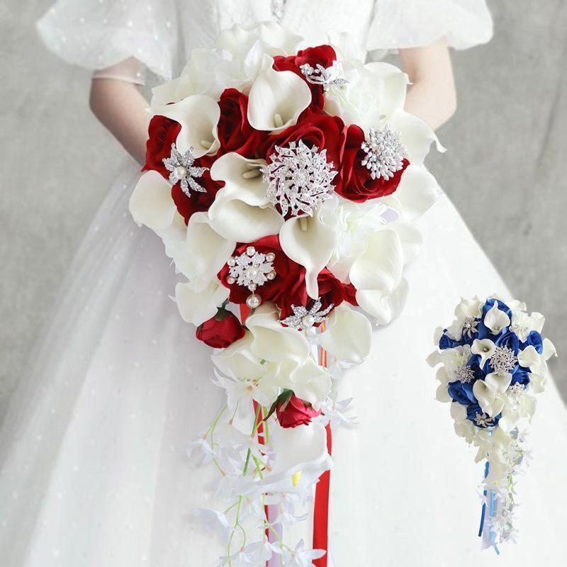 ウェディングブーケ ブライダルブーケ キャスケードブーケ オランダカイウ ビジュー ウエディングブーケ 花嫁 ブーケ 造花 結婚式 二次会 ワインレッド 赤