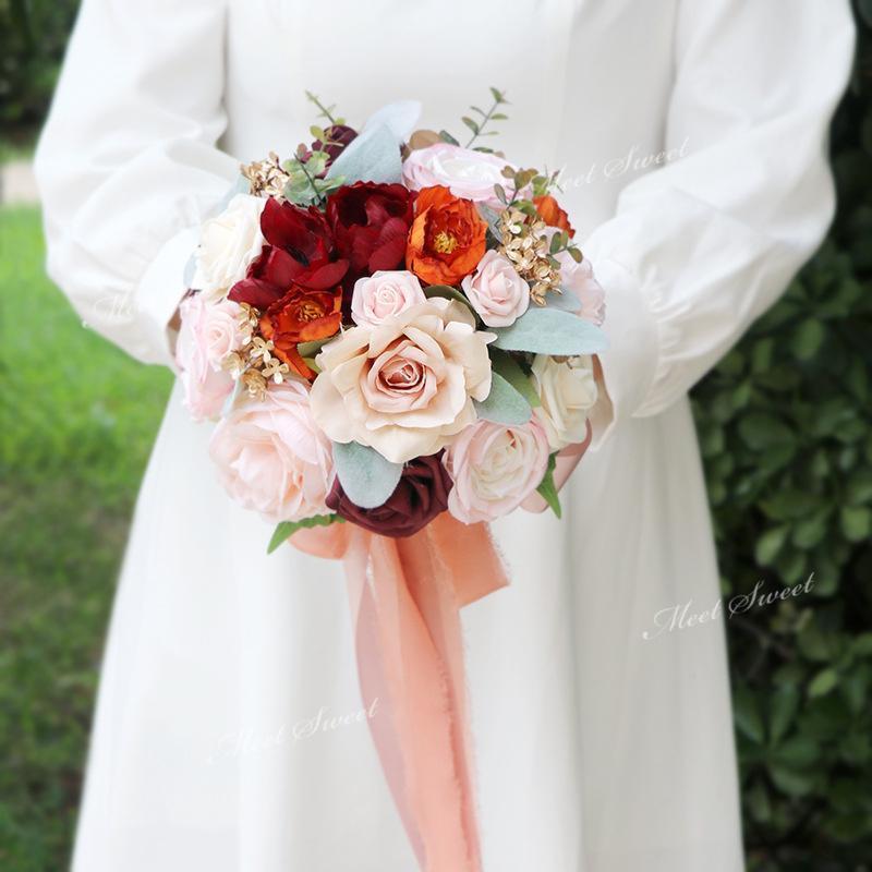 ブーケ 造花 ウェディングブーケ ブライダルブーケ ラウンドブーケ ウエディングブーケ 花嫁 フラワーブーケ 可愛い 結婚式 二次会 披露宴 オレンジ ピンク