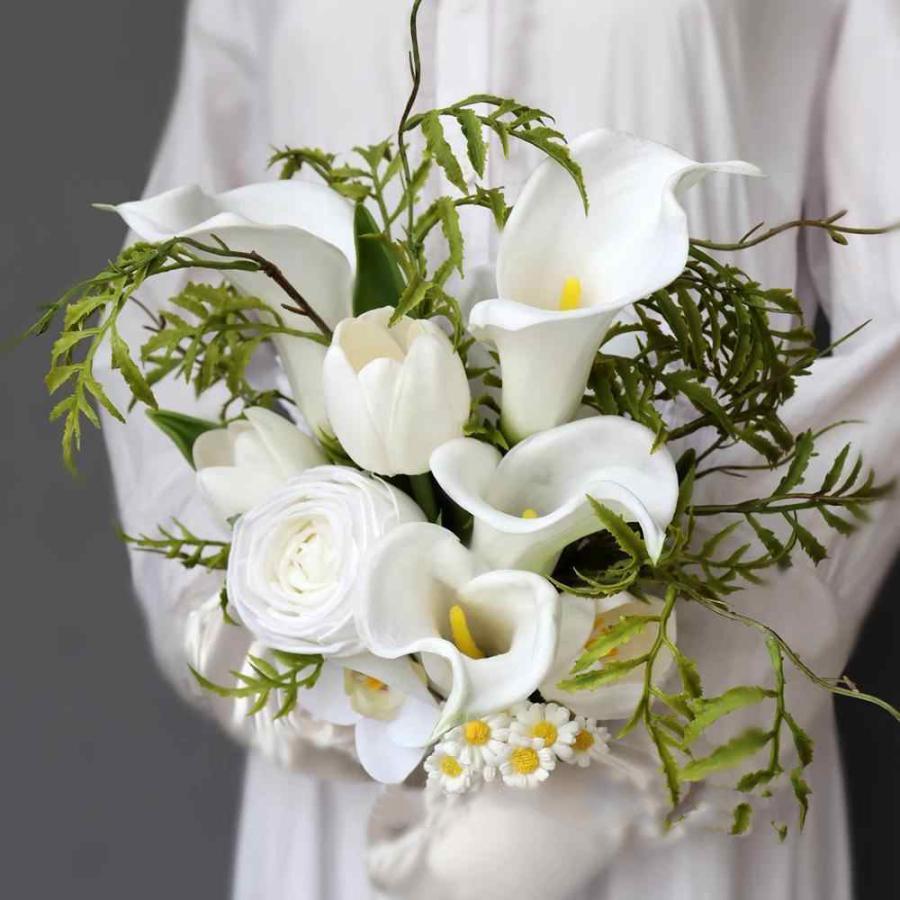 ウェディングブーケ ブライダル チューリップ オランダカイウ 胡蝶蘭 オーバルブーケ ブライダル 花嫁 ブーケ 造花 可愛い 結婚式 二次会 ホワイト 白